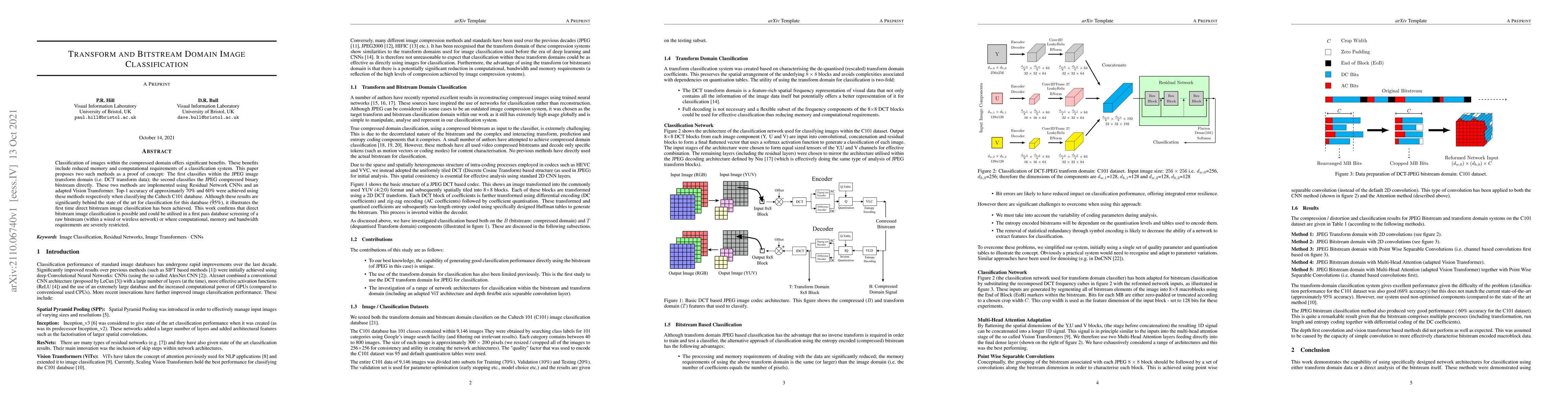 Classification of images within the compressed domain offers significant benefits. These benefits include reduced memory and computational requirements of a classification system. This paper proposes two such methods as a proof of concept: The first classifies within the JPEG image transform domain (i.e. DCT transform data); the second classifies the JPEG compressed binary bitstream directly. These two methods are implemented using Residual Network CNNs and an adapted Vision Transformer. Top-1 accuracy of approximately 70% and 60% were achieved using these methods respectively when classifying the Caltech C101 database. Although these results are significantly behind the state of the art for classification for this database (~95%), it illustrates the first time direct bitstream image classification has been achieved. This work confirms that direct bitstream image classification is possible and could be utilised in a first pass database screening of a raw bitstream (within a wired or wireless network) or where computational, memory and bandwidth requirements are severely restricted.