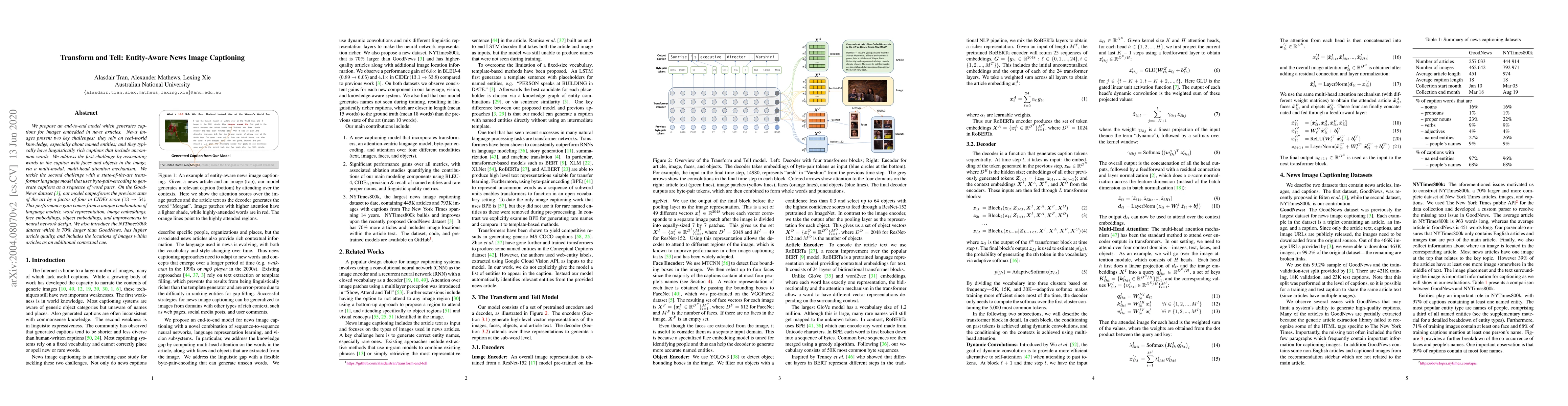 We propose an end-to-end model which generates captions for images embedded in news articles. News images present two key challenges: they rely on real-world knowledge, especially about named entities; and they typically have linguistically rich captions that include uncommon words. We address the first challenge by associating words in the caption with faces and objects in the image, via a multi-modal, multi-head attention mechanism. We tackle the second challenge with a state-of-the-art transformer language model that uses byte-pair-encoding to generate captions as a sequence of word parts. On the GoodNews dataset, our model outperforms the previous state of the art by a factor of four in CIDEr score (13 to 54). This performance gain comes from a unique combination of language models, word representation, image embeddings, face embeddings, object embeddings, and improvements in neural network design. We also introduce the NYTimes800k dataset which is 70% larger than GoodNews, has higher article quality, and includes the locations of images within articles as an additional contextual cue.