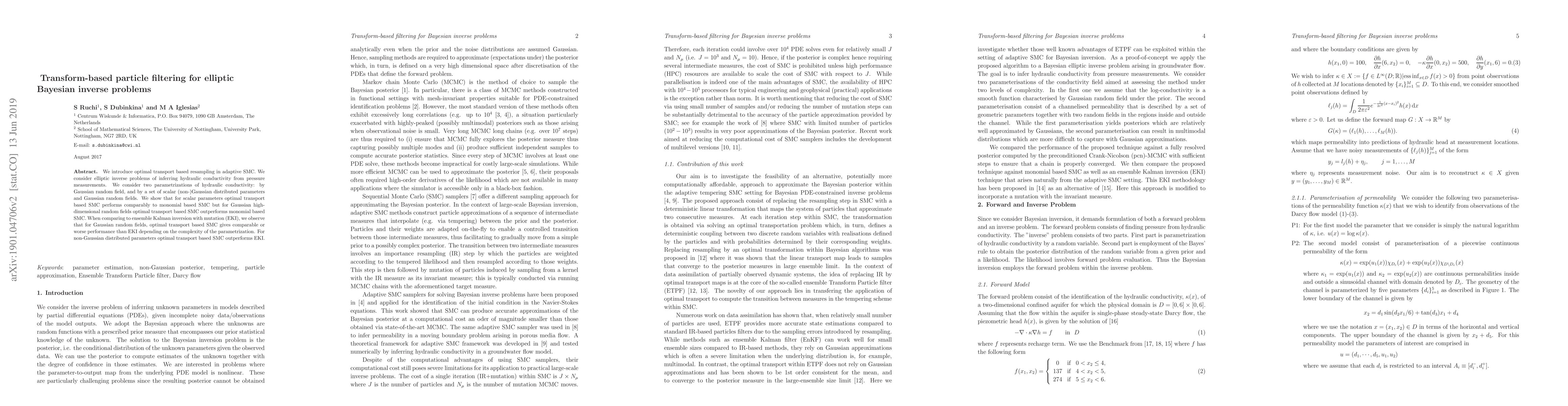 We introduce optimal transport based resampling in adaptive SMC. We consider elliptic inverse problems of inferring hydraulic conductivity from pressure measurements. We consider two parametrizations of hydraulic conductivity: by Gaussian random field, and by a set of scalar (non-)Gaussian distributed parameters and Gaussian random fields. We show that for scalar parameters optimal transport based SMC performs comparably to monomial based SMC but for Gaussian high-dimensional random fields optimal transport based SMC outperforms monomial based SMC. When comparing to ensemble Kalman inversion with mutation (EKI), we observe that for Gaussian random fields, optimal transport based SMC gives comparable or worse performance than EKI depending on the complexity of the parametrization. For non-Gaussian distributed parameters optimal transport based SMC outperforms EKI.