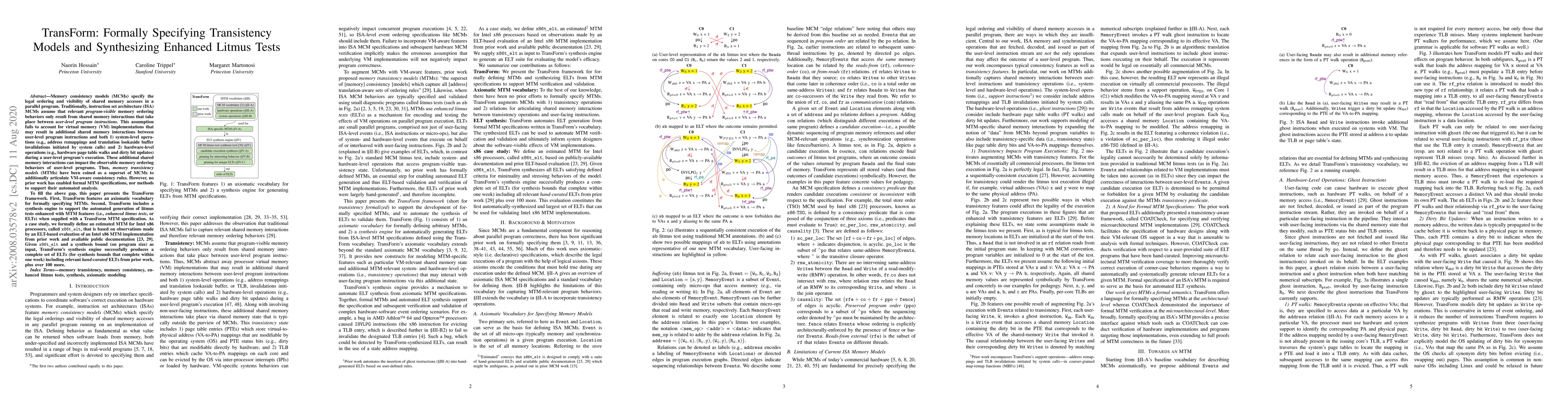 Memory consistency models (MCMs) specify the legal ordering and visibility of shared memory accesses in a parallel program. Traditionally, instruction set architecture (ISA) MCMs assume that relevant program-visible memory ordering behaviors only result from shared memory interactions that take place between user-level program instructions. This assumption fails to account for virtual memory (VM) implementations that may result in additional shared memory interactions between user-level program instructions and both 1) system-level operations (e.g., address remappings and translation lookaside buffer invalidations initiated by system calls) and 2) hardware-level operations (e.g., hardware page table walks and dirty bit updates) during a user-level program's execution. These additional shared memory interactions can impact the observable memory ordering behaviors of user-level programs. Thus, memory transistency models (MTMs) have been coined as a superset of MCMs to additionally articulate VM-aware consistency rules. However, no prior work has enabled formal MTM specifications, nor methods to support their automated analysis. To fill the above gap, this paper presents the TransForm framework. First, TransForm features an axiomatic vocabulary for formally specifying MTMs. Second, TransForm includes a synthesis engine to support the automated generation of litmus tests enhanced with MTM features (i.e., enhanced litmus tests, or ELTs) when supplied with a TransForm MTM specification. As a case study, we formally define an estimated MTM for Intel x86 processors, called x86t_elt, that is based on observations made by an ELT-based evaluation of an Intel x86 MTM implementation from prior work and available public documentation. Given x86t_elt and a synthesis bound as input, TransForm's synthesis engine successfully produces a set of ELTs including relevant ELTs from prior work.