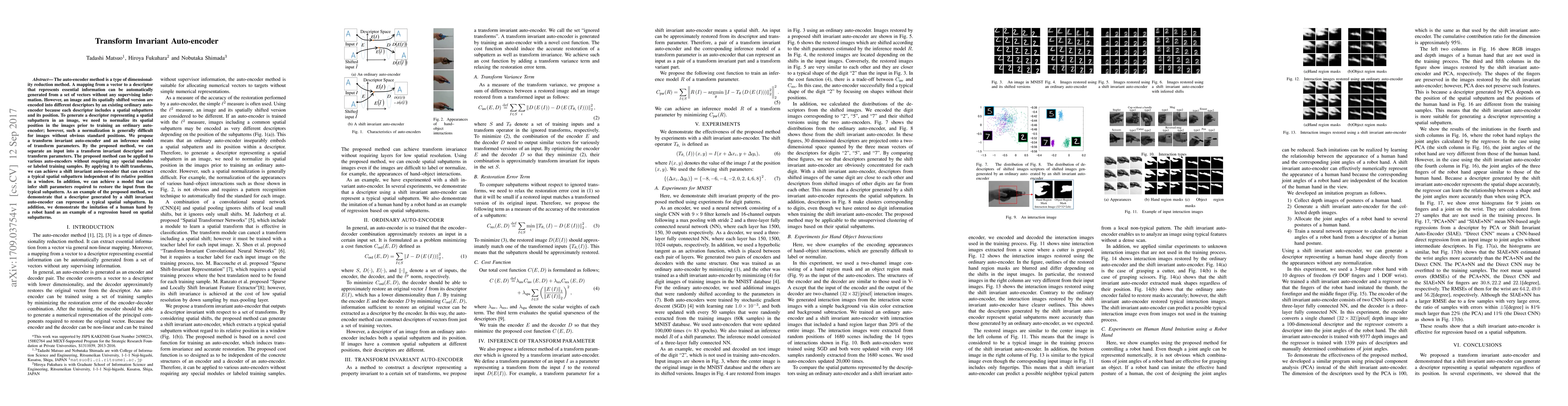 The auto-encoder method is a type of dimensionality reduction method. A mapping from a vector to a descriptor that represents essential information can be automatically generated from a set of vectors without any supervising information. However, an image and its spatially shifted version are encoded into different descriptors by an existing ordinary auto-encoder because each descriptor includes a spatial subpattern and its position. To generate a descriptor representing a spatial subpattern in an image, we need to normalize its spatial position in the images prior to training an ordinary auto-encoder; however, such a normalization is generally difficult for images without obvious standard positions. We propose a transform invariant auto-encoder and an inference model of transform parameters. By the proposed method, we can separate an input into a transform invariant descriptor and transform parameters. The proposed method can be applied to various auto-encoders without requiring any special modules or labeled training samples. By applying it to shift transforms, we can achieve a shift invariant auto-encoder that can extract a typical spatial subpattern independent of its relative position in a window. In addition, we can achieve a model that can infer shift parameters required to restore the input from the typical subpattern. As an example of the proposed method, we demonstrate that a descriptor generated by a shift invariant auto-encoder can represent a typical spatial subpattern. In addition, we demonstrate the imitation of a human hand by a robot hand as an example of a regression based on spatial subpatterns.