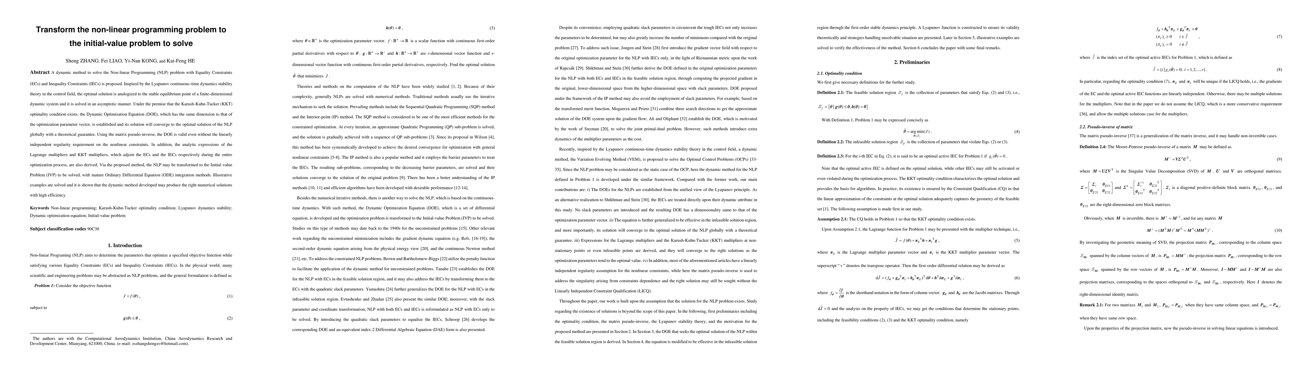 A dynamic method to solve the Non-linear Programming (NLP) problem with Equality Constraints (ECs) and Inequality Constraints (IECs) is proposed. Inspired by the Lyapunov continuous-time dynamics stability theory in the control field, the optimal solution is analogized to the stable equilibrium point of a finite-dimensional dynamic system and it is solved in an asymptotic manner. Under the premise that the Karush-Kuhn-Tucker (KKT) optimality condition exists, the Dynamic Optimization Equation (DOE), which has the same dimension to that of the optimization parameter vector, is established and its solution will converge to the optimal solution of the NLP globally with a theoretical guarantee. Using the matrix pseudo-inverse, the DOE is valid even without the linearly independent regularity requirement on the nonlinear constraints. In addition, the analytic expressions of the Lagrange multipliers and KKT multipliers, which adjoin the ECs and the IECs respectively during the entire optimization process, are also derived. Via the proposed method, the NLP may be transformed to the Initial-value Problem (IVP) to be solved, with mature Ordinary Differential Equation (ODE) integration methods. Illustrative examples are solved and it is shown that the dynamic method developed may produce the right numerical solutions with high efficiency.