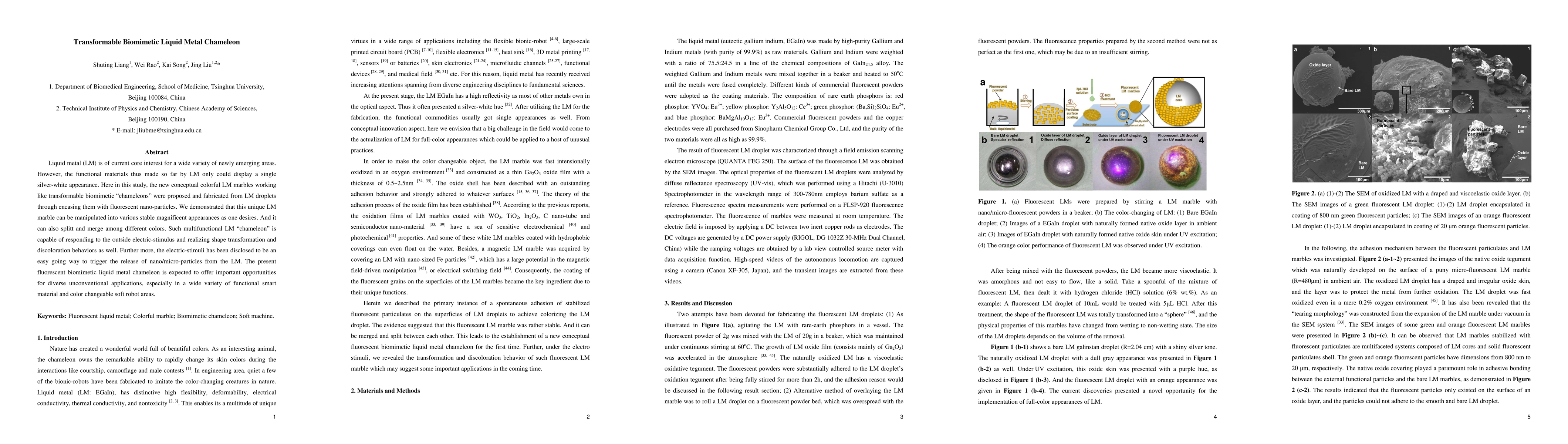 This study introduces a novel liquid metal marble encasing fluorescent nanoparticles, enabling it to transform into various colors and shapes under electric-stimulus. The material's ability to split and merge colors and release nanoparticles opens up potential applications in smart materials and color-changeable soft robotics.
