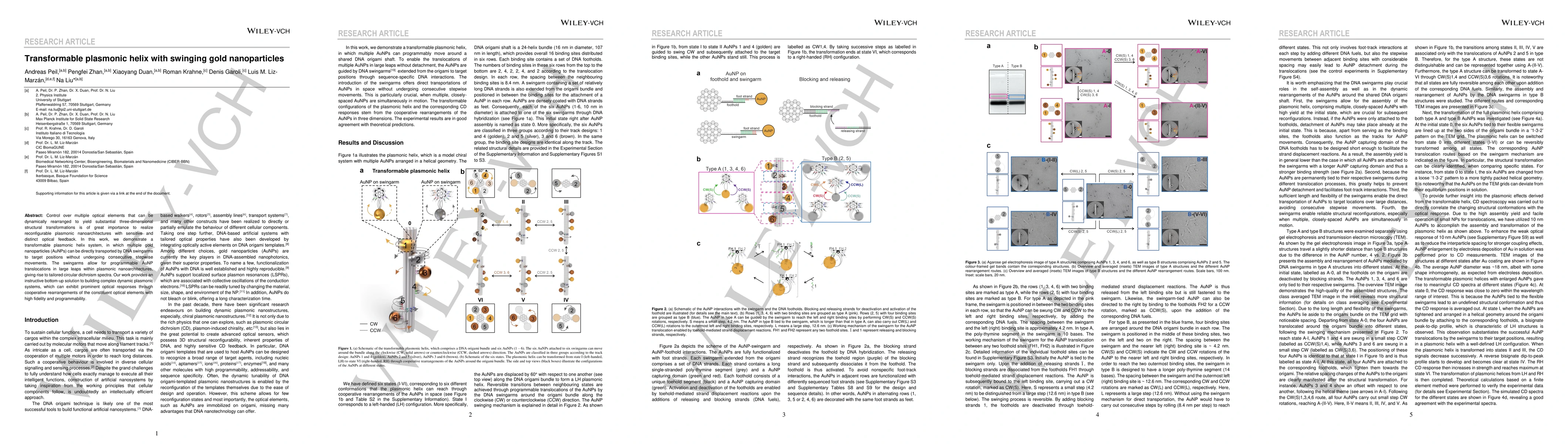 Control over multiple optical elements that can be dynamically rearranged to yield substantial three-dimensional structural transformations is of great importance to realize reconfigurable plasmonic nanoarchitectures with sensitive and distinct optical feedback. In this work, we demonstrate a transformable plasmonic helix system, in which multiple gold nanoparticles (AuNPs) can be directly transported by DNA swingarms to target positions without undergoing consecutive stepwise movements. The swingarms allow for programmable AuNP translocations in large leaps within plasmonic nanoarchitectures, giving rise to tailored circular dichroism spectra. Our work provides an instructive bottom-up solution to building complex dynamic plasmonic systems, which can exhibit prominent optical responses through cooperative rearrangements of the constituent optical elements with high fidelity and programmability.
