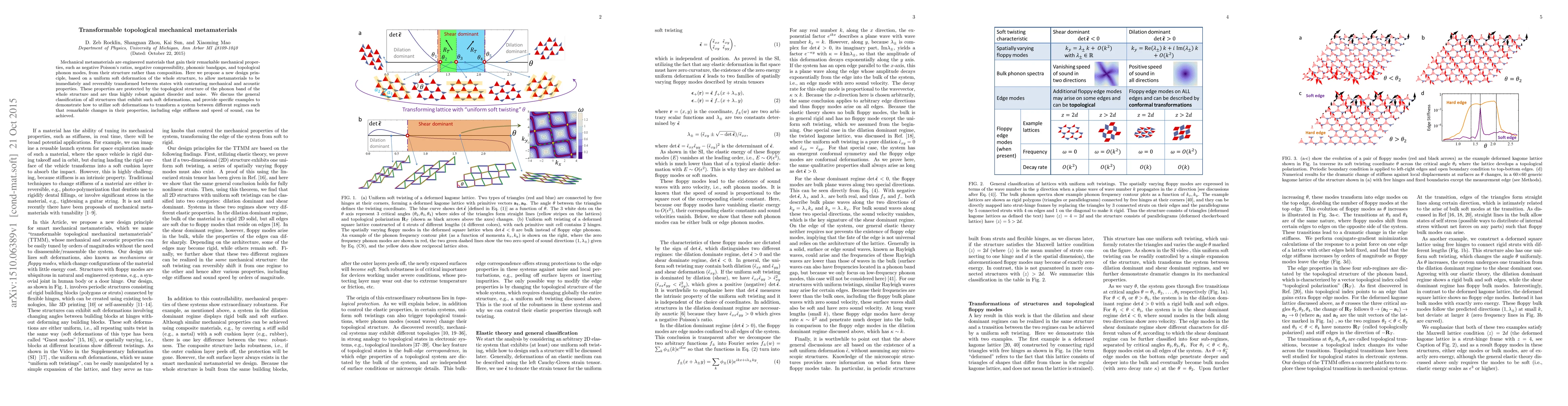 This paper introduces a design principle for transformable mechanical metamaterials that can reversibly change between states with distinct mechanical and acoustic properties through uniform soft deformations. These transformations are robust due to the topological structure of the material's phonon band, enabling significant changes in properties like edge stiffness and speed of sound.