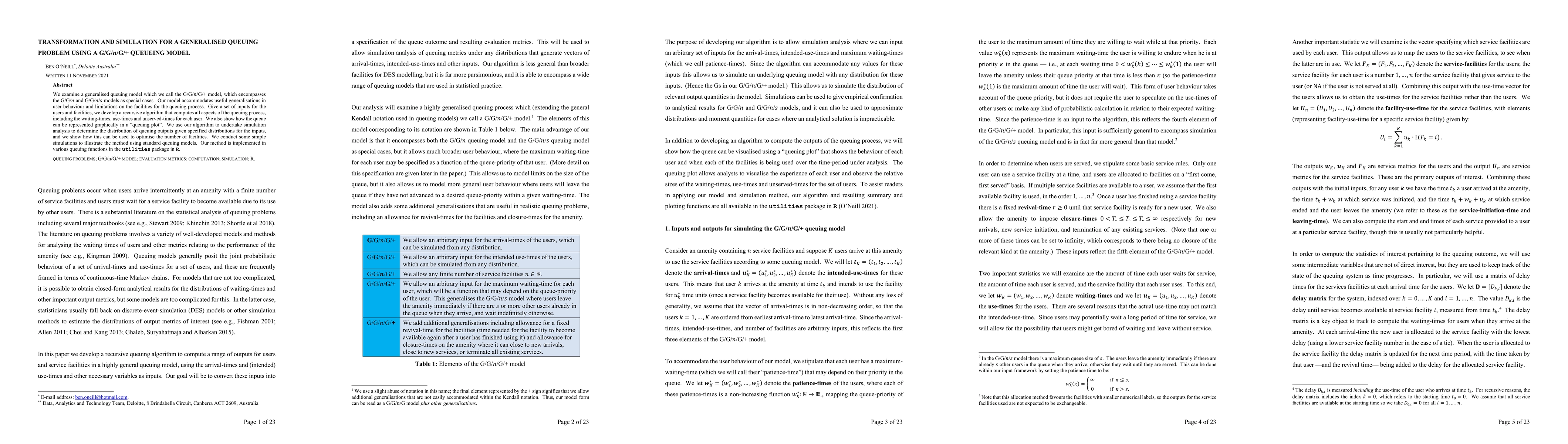 We examine a generalised queuing model which we call the G/G/n/G/+ model, which encompasses the G/G/n and G/G/n/s models as special cases. Our model accommodates useful generalisations in user behaviour and limitations on the facilities for the queuing process. Give a set of inputs for the users and facilities, we develop a recursive algorithm that computes all aspects of the queuing process, including the waiting-times, use-times and unserved-times for each user. We also show how the queue can be represented graphically in a "queuing plot". We use our algorithm to undertake simulation analysis to determine the distribution of queuing outputs given specified distributions for the inputs, and we show how this can be used to optimise the number of facilities. We conduct some simple simulations to illustrate the method using standard queuing models. Our method is implemented in various queuing functions in the utilities package in R.