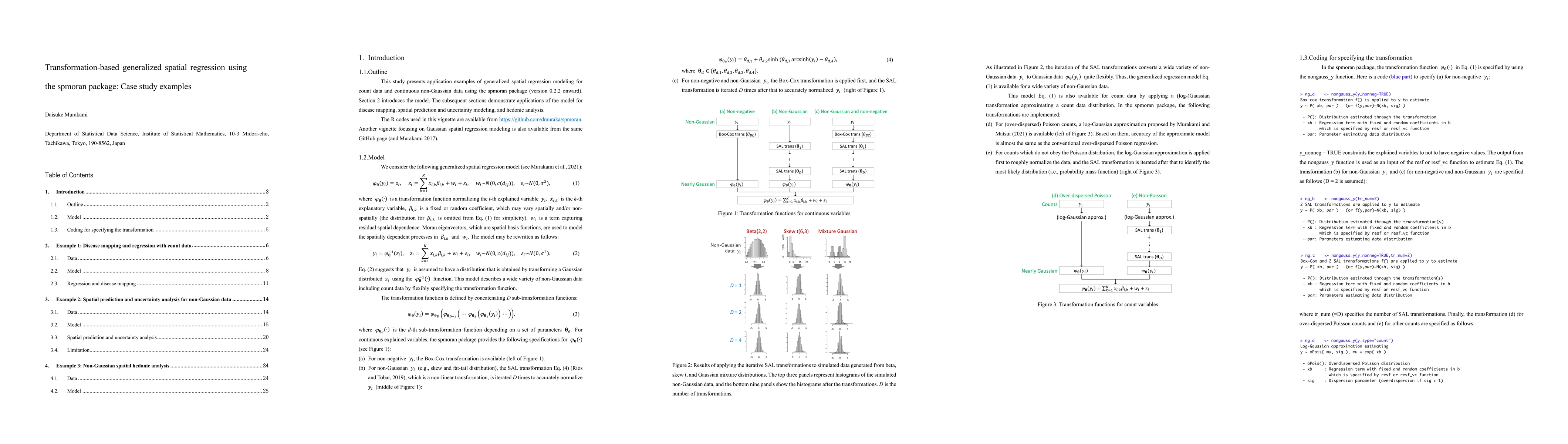 This paper showcases the application of the spmoran package for generalized spatial regression modeling of count and continuous non-Gaussian data, with examples in disease mapping, spatial prediction, and hedonic analysis. R codes for the examples are available on GitHub.