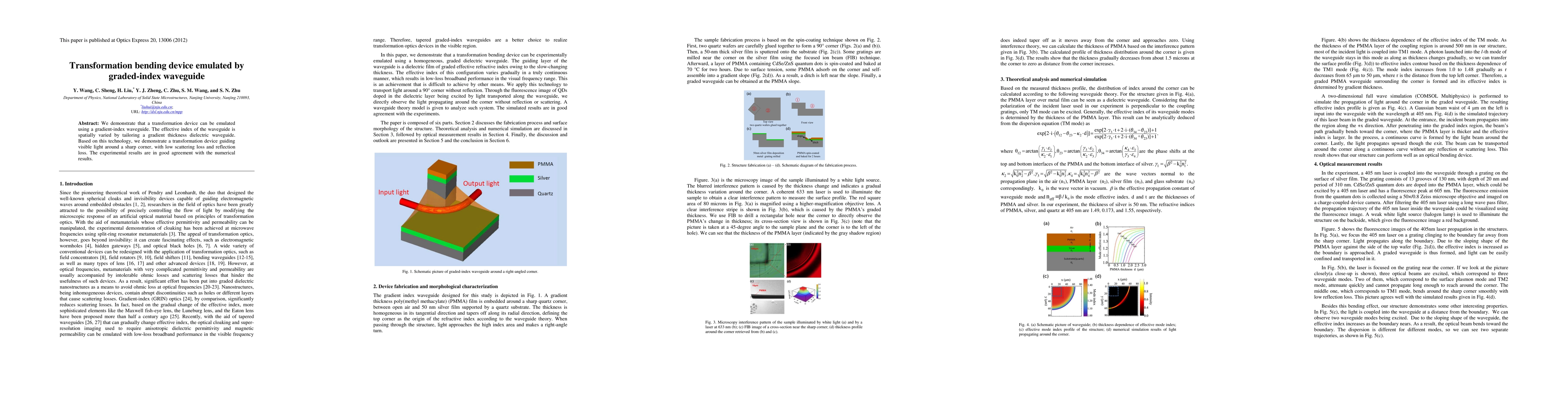 Researchers demonstrate a transformation device that bends visible light around sharp corners using a graded-index waveguide with tailored gradient thickness dielectric, achieving low scattering loss and reflection.
