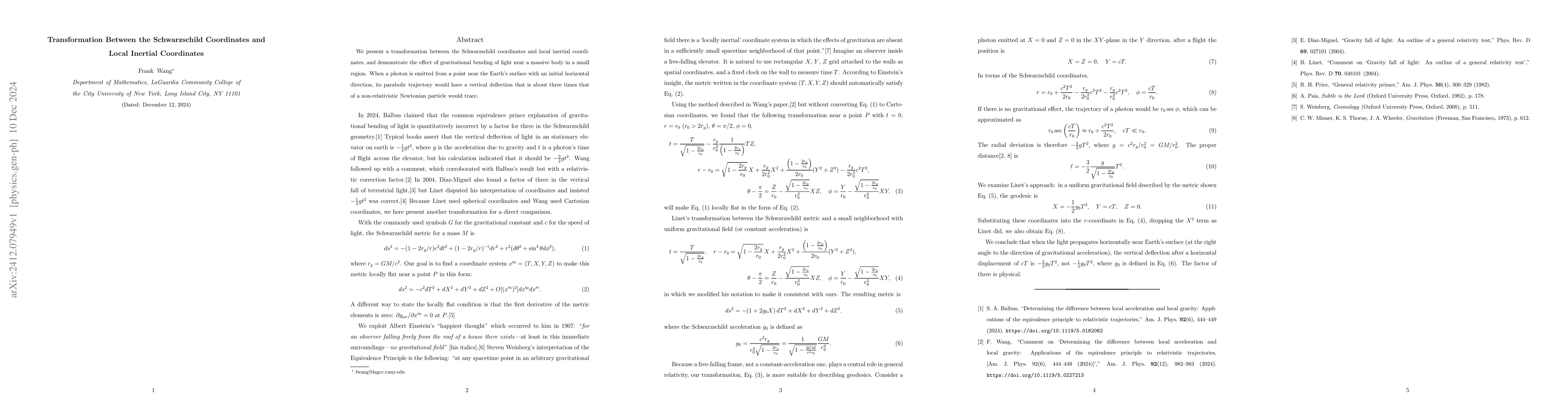 This paper introduces a transformation between Schwarzschild and local inertial coordinates, illustrating the significant gravitational bending of light near a massive object. It shows that a photon emitted horizontally near Earth’s surface experiences a vertical deflection three times greater than predicted by Newtonian mechanics.