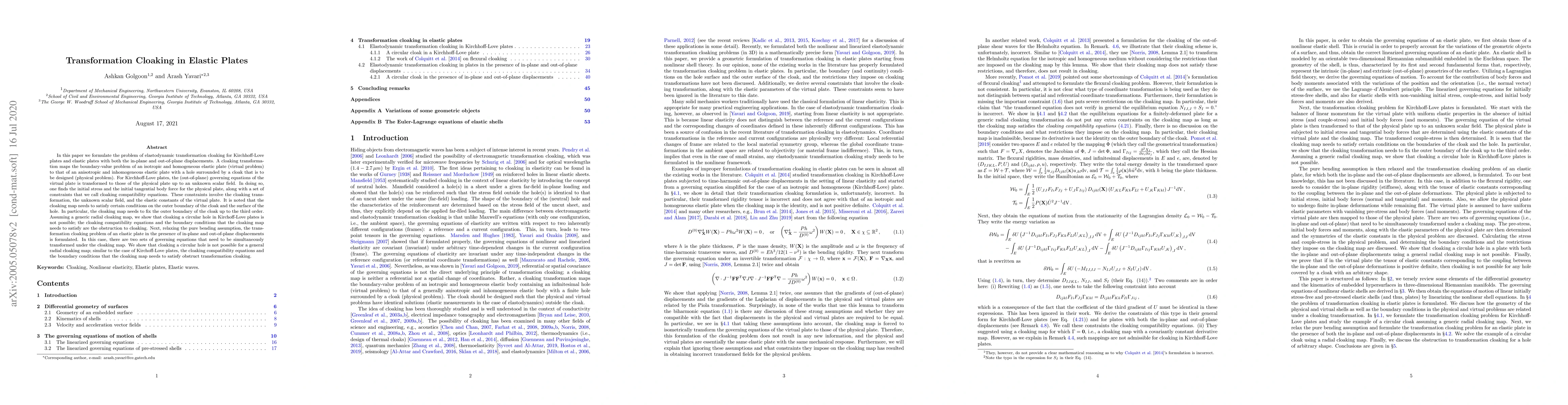 The paper derives cloaking compatibility equations for both Kirchhoff-Love plates and elastic plates with in-plane and out-of-plane displacements, demonstrating the obstructions to cloaking a circular hole.