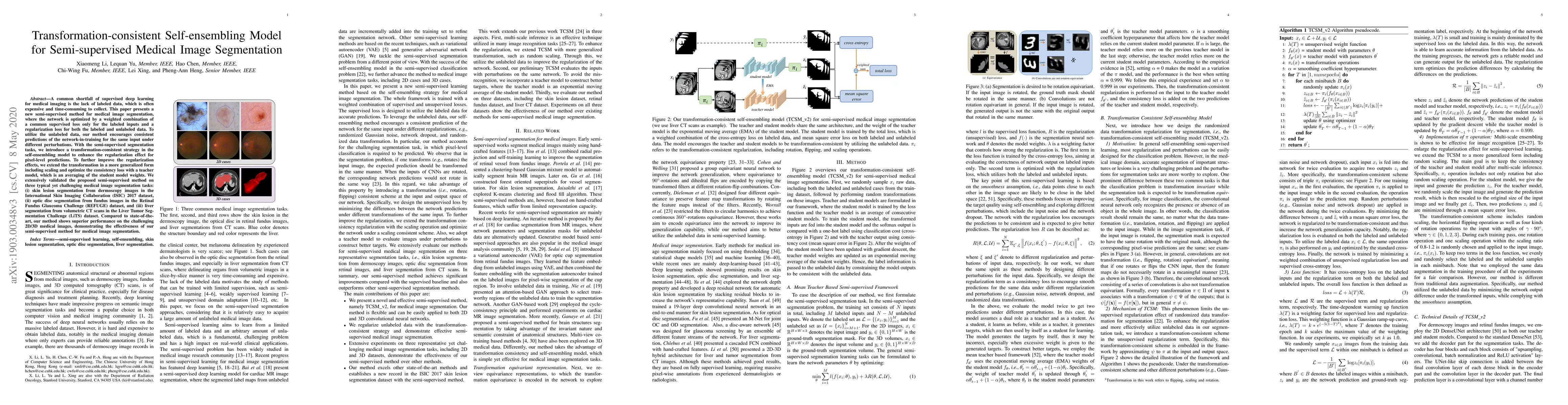 This paper introduces a semi-supervised deep learning method for medical image segmentation that combines supervised and regularization losses to leverage both labeled and unlabeled data. The proposed transformation consistent self-ensembling model enhances pixel-level predictions, achieving superior segmentation performance on skin lesion, optic disc, and liver segmentation tasks.