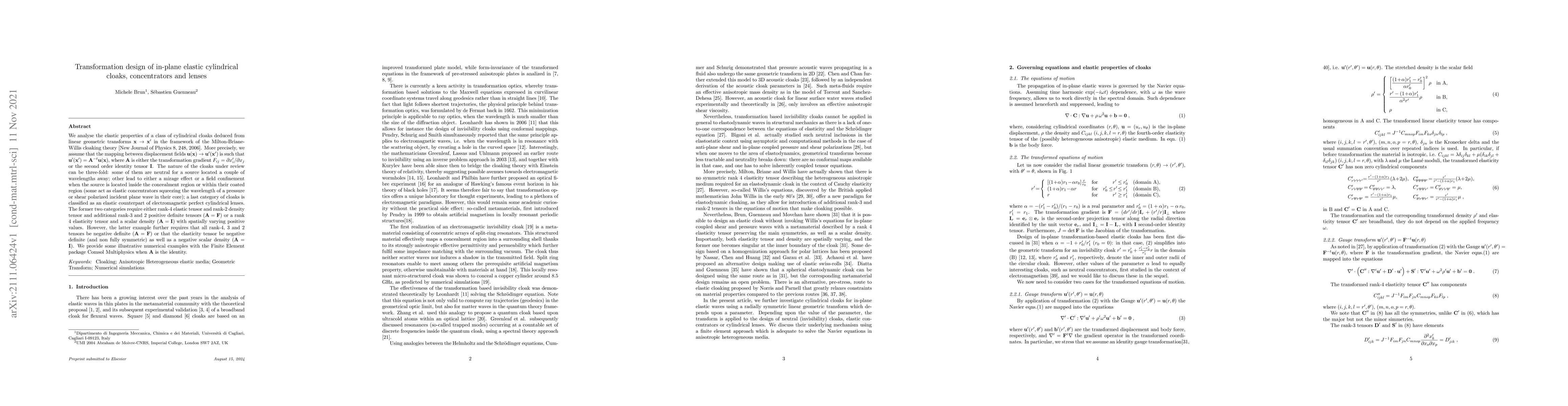 This paper investigates the elastic properties of cylindrical cloaks, concentrators, and lenses through linear geometric transformations. It explores different cloak types based on the transformation tensor ${\bf A}$, including neutral cloaks, mirage effects, and elastic lenses. Numerical examples using Comsol Multiphysics demonstrate the theoretical findings.