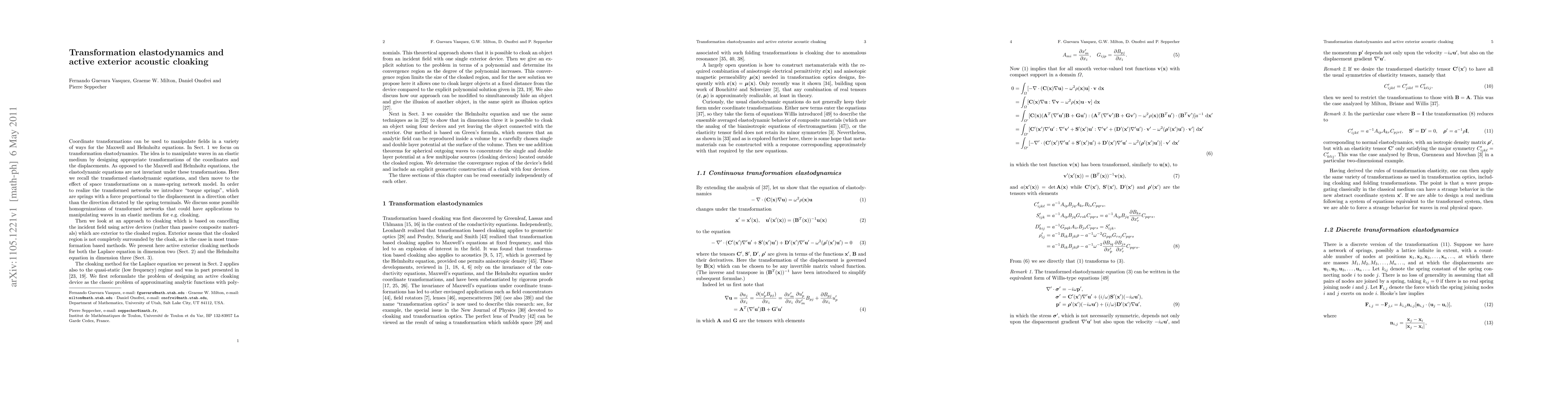 This chapter consists of three parts. In the first part we recall the elastodynamic equations under coordinate transformations. The idea is to use coordinate transformations to manipulate waves propagating in an elastic material. Then we study the effect of transformations on a mass-spring network model. The transformed networks can be realized with "torque springs", which are introduced here and are springs with a force proportional to the displacement in a direction other than the direction of the spring terminals. Possible homogenizations of the transformed networks are presented, with potential applications to cloaking. In the second and third parts we present cloaking methods that are based on cancelling an incident field using active devices which are exterior to the cloaked region and that do not generate significant fields far away from the devices. In the second part, the exterior cloaking problem for the Laplace equation is reformulated as the problem of polynomial approximation of analytic functions. An explicit solution is given that allows to cloak larger objects at a fixed distance from the cloaking device, compared to previous explicit solutions. In the third part we consider the active exterior cloaking problem for the Helmholtz equation in 3D. Our method uses the Green's formula and an addition theorem for spherical outgoing waves to design devices that mimic the effect of the single and double layer potentials in Green's formula.