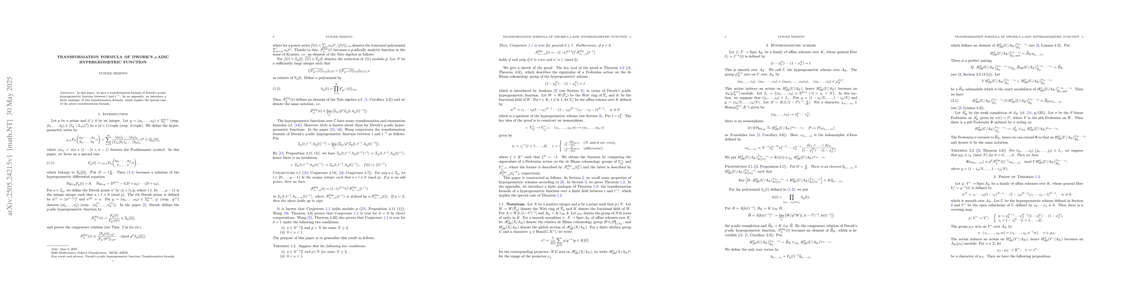 This paper presents a transformation formula for Dwork's p-adic hypergeometric function relating variables t and t^(-1). An appendix introduces a finite version of this formula, which verifies a specific instance of the primary transformation.