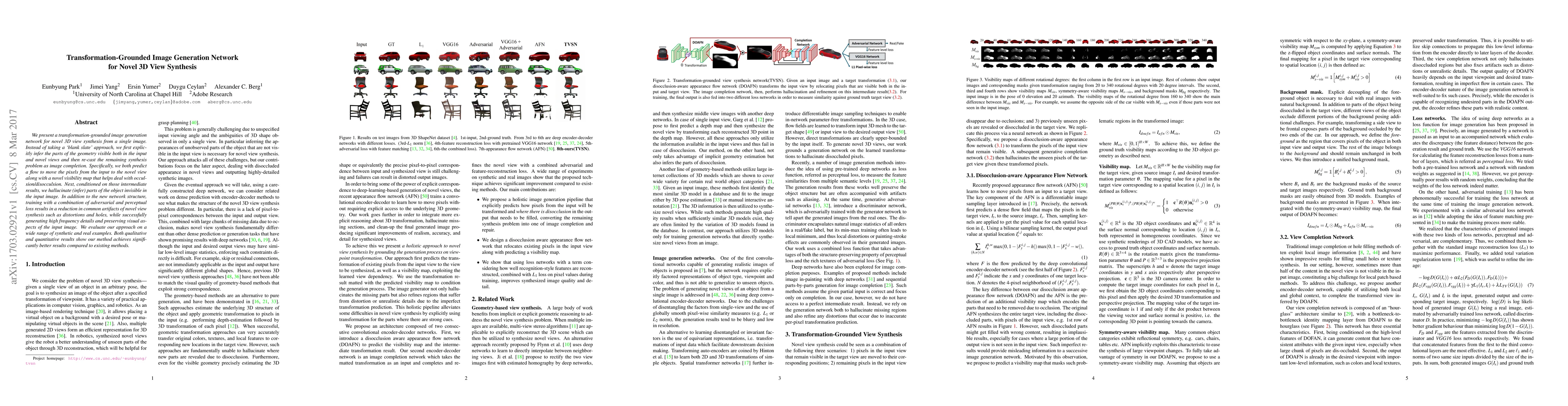 The paper presents a transformation-grounded image generation network for novel 3D view synthesis from a single image. It infers visible geometry parts in both input and novel views, recasts the remaining synthesis problem as image completion, predicts flow and a visibility map, and hallucinates invisible object parts conditioned on intermediate results.