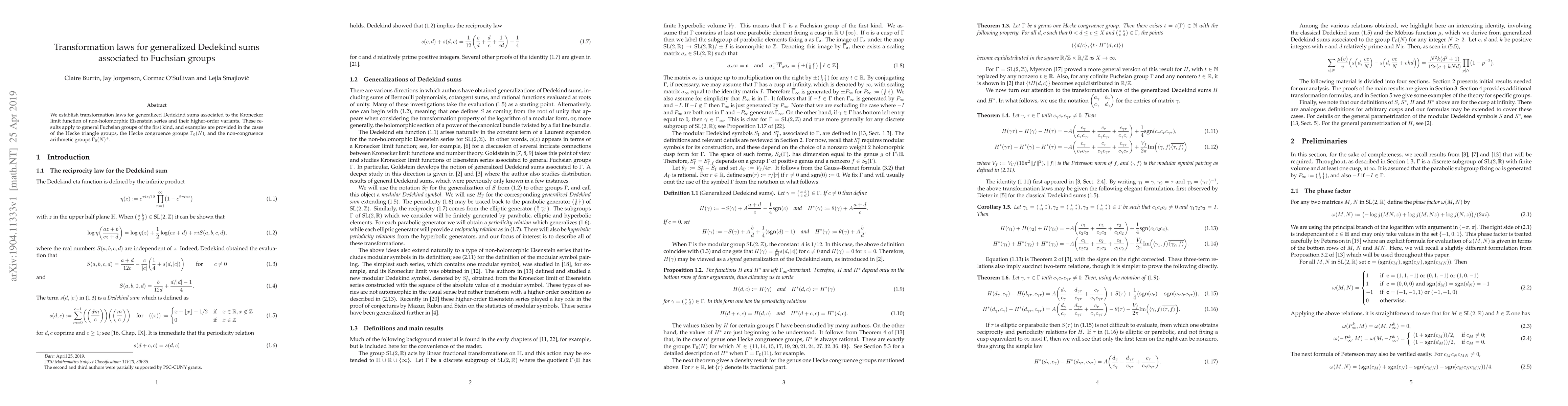 Summary: This paper presents transformation laws for generalized Dedekind sums linked to the Kronecker limit function of non-holomorphic Eisenstein series, applicable to Fuchsian groups, with specific examples given for Hecke triangle groups, $\Gamma_0(N)$, and $\Gamma_0(N)^+$.