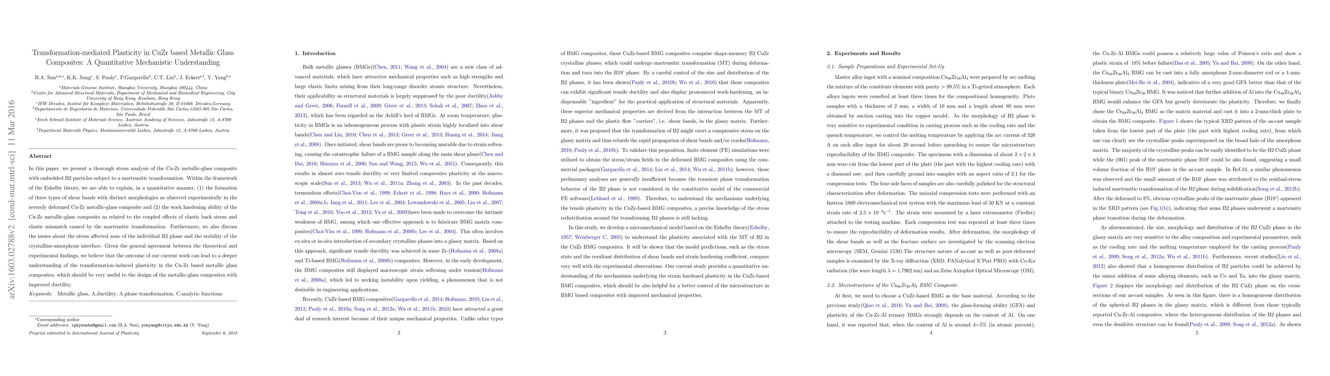 This paper quantitatively analyzes the stress behavior of Cu-Zr metallic-glass composites with B2 particles undergoing martensitic transformation, explaining the formation of three shear bands and work hardening via elastic back stress and mismatch, and discusses the stability of the crystalline-amorphous interface. The findings enhance understanding of transformation-induced plasticity in Cu-Zr composites, aiding in the design of more ductile materials.