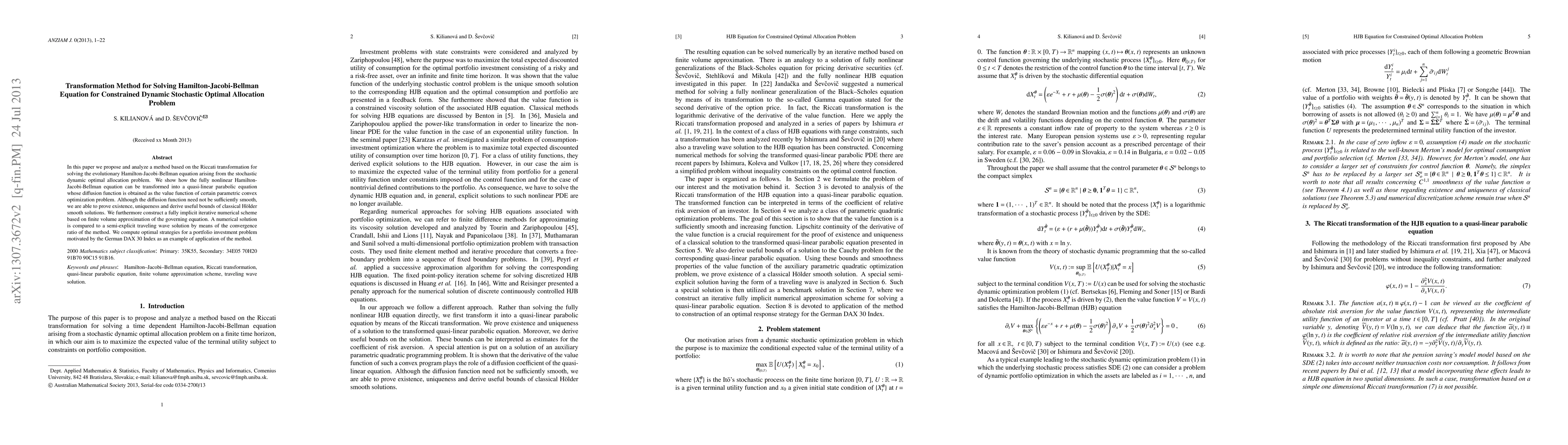 In this paper we propose and analyze a method based on the Riccati transformation for solving the evolutionary Hamilton-Jacobi-Bellman equation arising from the stochastic dynamic optimal allocation problem. We show how the fully nonlinear Hamilton-Jacobi-Bellman equation can be transformed into a quasi-linear parabolic equation whose diffusion function is obtained as the value function of certain parametric convex optimization problem. Although the diffusion function need not be sufficiently smooth, we are able to prove existence, uniqueness and derive useful bounds of classical H\"older smooth solutions. We furthermore construct a fully implicit iterative numerical scheme based on finite volume approximation of the governing equation. A numerical solution is compared to a semi-explicit traveling wave solution by means of the convergence ratio of the method. We compute optimal strategies for a portfolio investment problem motivated by the German DAX 30 Index as an example of application of the method.