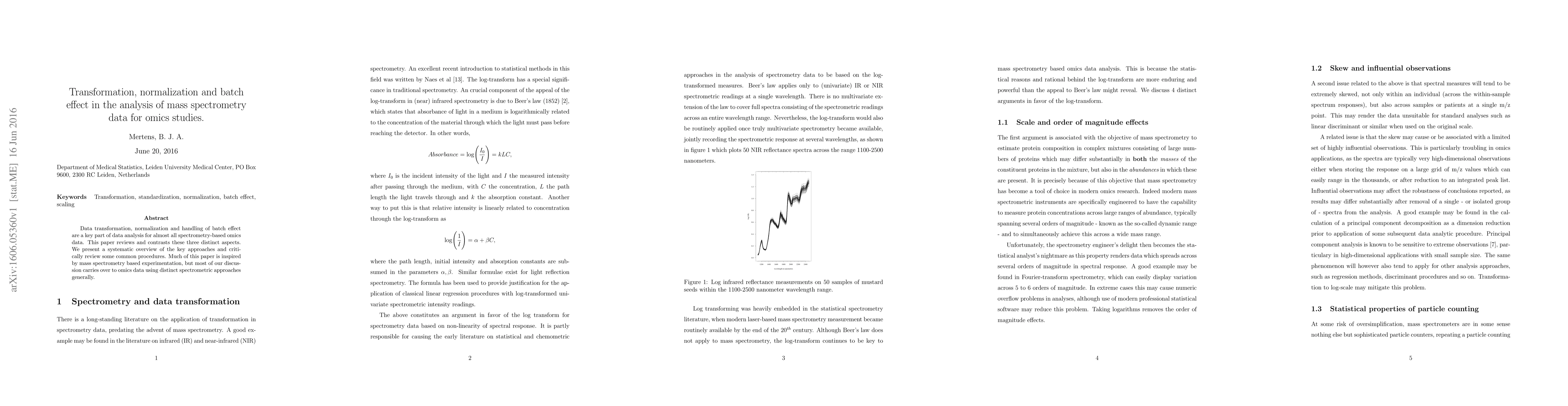 This paper reviews key data transformation, normalization, and batch effect correction techniques for mass spectrometry-based omics studies, providing a systematic overview of the approaches and critically evaluating common procedures. The discussion is largely inspired by mass spectrometry but is broadly applicable to other spectrometric omics data.