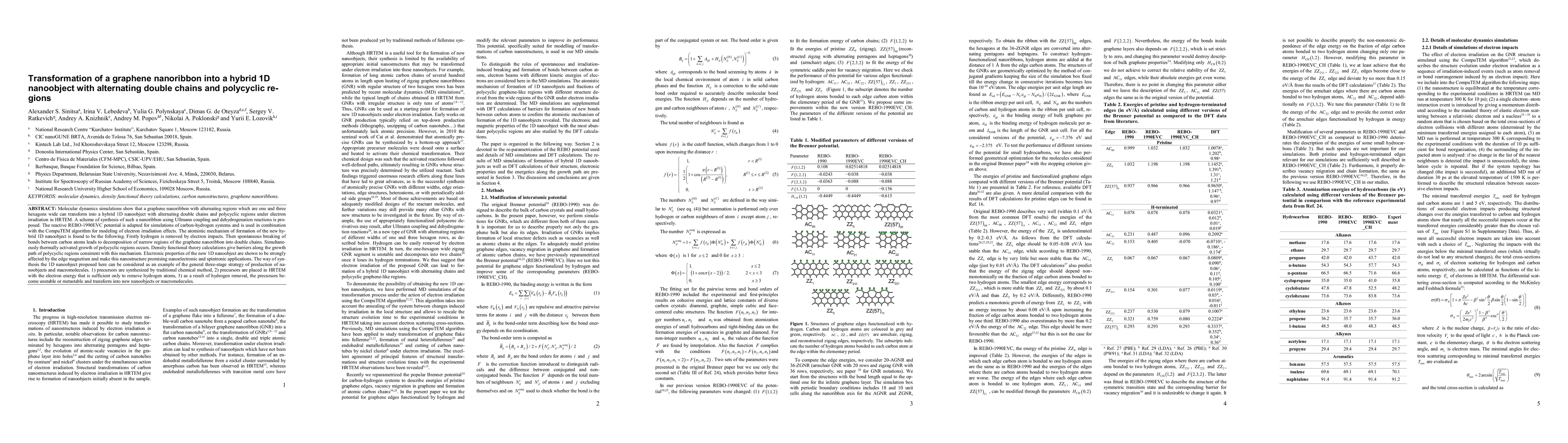 This paper reports on the transformation of a graphene nanoribbon into a hybrid 1D nanoobject under electron irradiation in HRTEM, achieved through hydrogen removal and bond breaking. The proposed synthesis method involves Ullmann coupling, dehydrogenation, and electron-induced reactions, with density functional theory supporting the mechanism. The new nanostructure has potential for nanoelectronics and spintronics due to its edge magnetism.