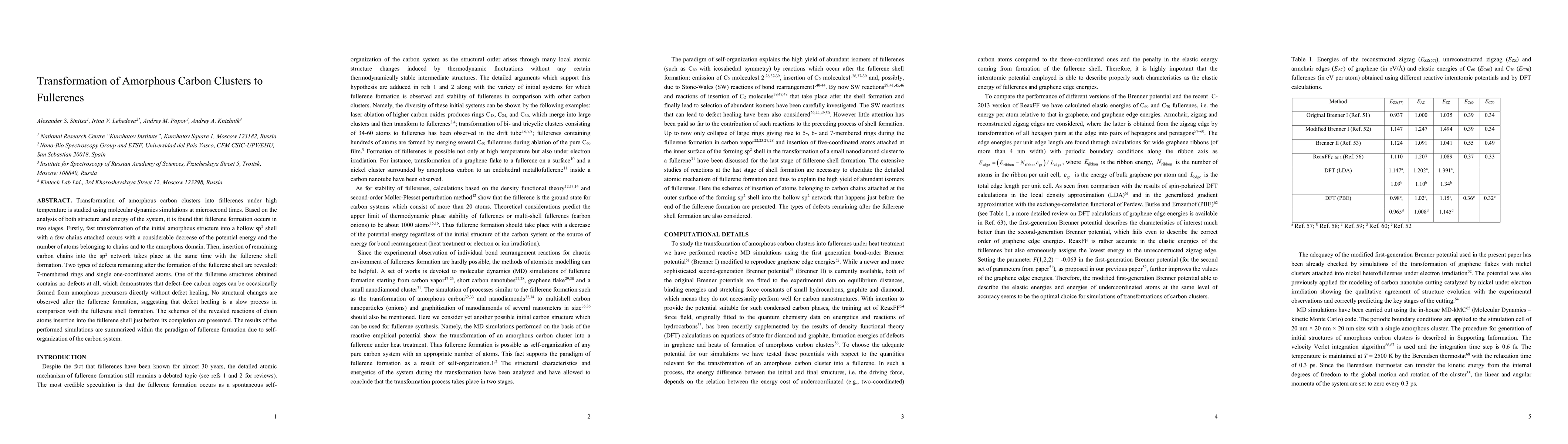 The study reveals that amorphous carbon clusters transform into fullerenes in two stages: initial rapid formation of a hollow sp$^2$ shell with attached chains, followed by insertion of remaining chains into the sp$^2$ network to complete the fullerene shell. Defect-free fullerenes can form directly from amorphous precursors, while defect healing is a slow process.