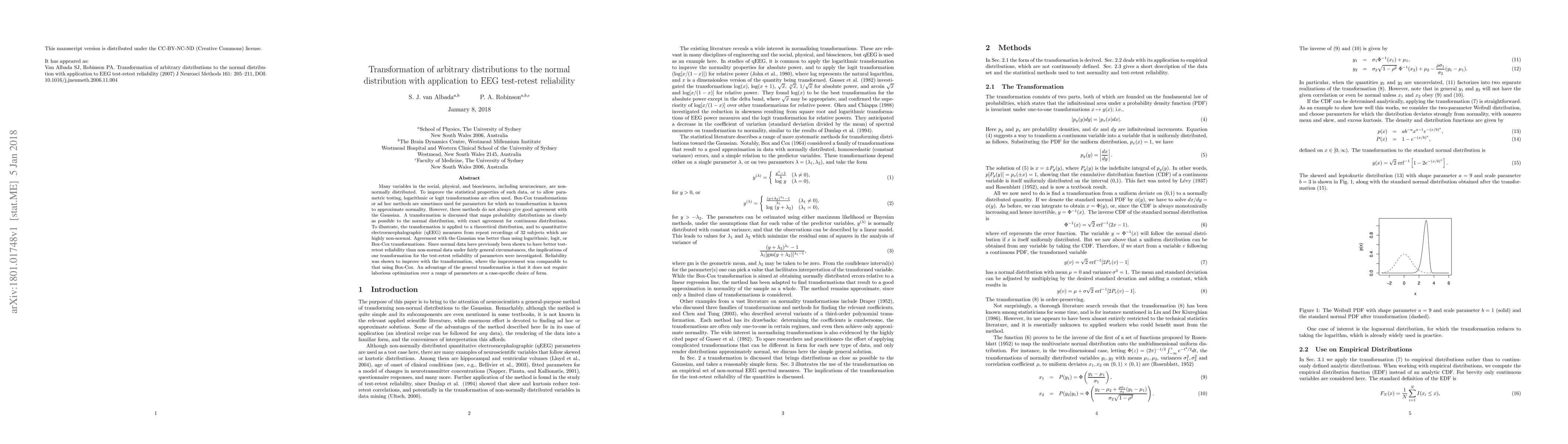 This paper proposes a transformation method to convert arbitrary distributions to the normal distribution, demonstrating its application on non-normal EEG data to enhance test-retest reliability. The method shows better agreement with Gaussian distribution and improved reliability compared to traditional transformations like logarithmic or Box-Cox.