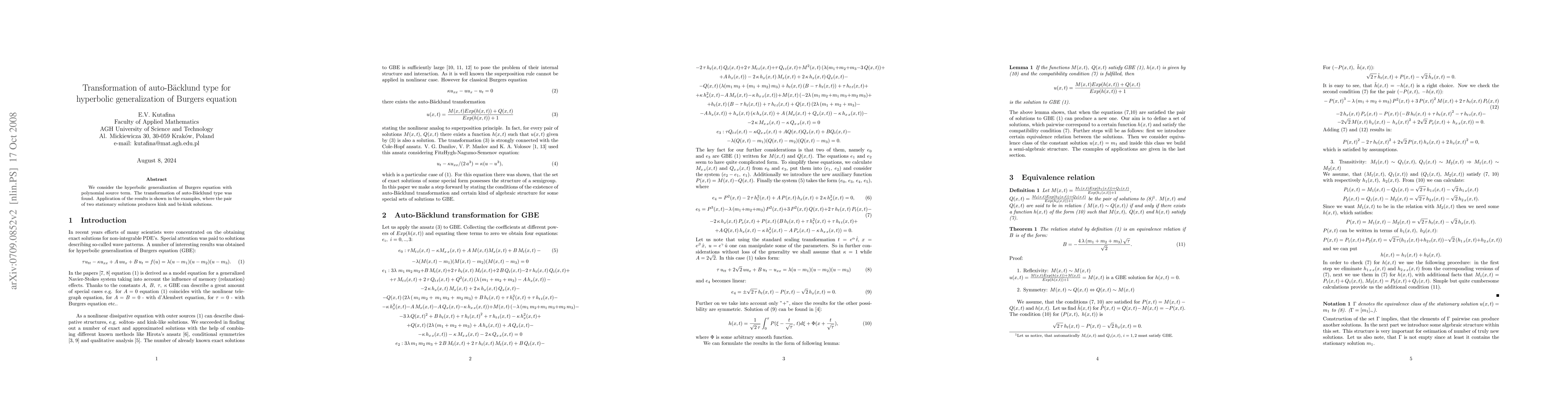 We consider the hyperbolic generalization of Burgers equation with polynomial source term. The transformation of auto-B\"{a}cklund type was found. Application of the results is shown in the examples, where the pair of two stationary solutions produces kink and bi-kink solutions.