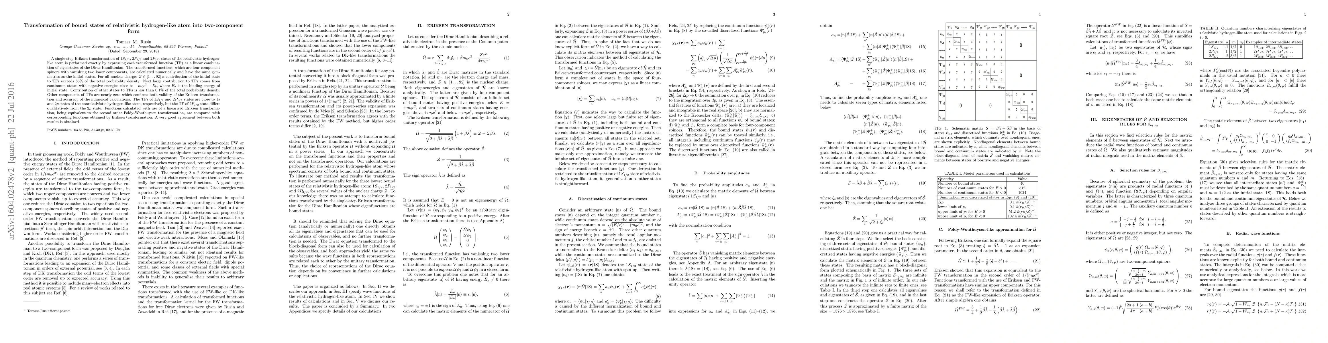 Researchers successfully transformed bound states of a relativistic hydrogen-like atom into two-component form using Eriksen transformation, with contributions from initial states exceeding 86% and continuum states contributing less than 0.1%.