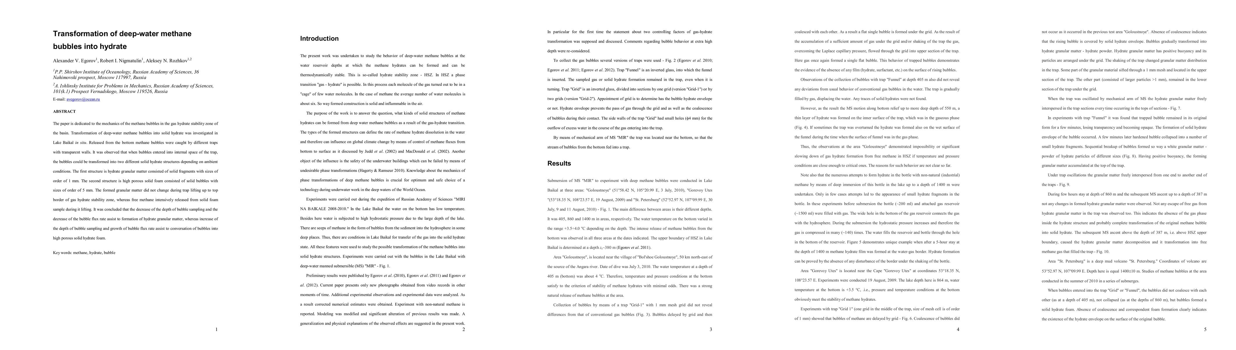 This study investigates the transformation of deep-water methane bubbles into solid hydrate in Lake Baikal's gas hydrate stability zone. The research found that methane bubbles form either granular matter or high porous solid foam hydrate, depending on ambient conditions, with depth and bubble flux rate influencing the transformation process.