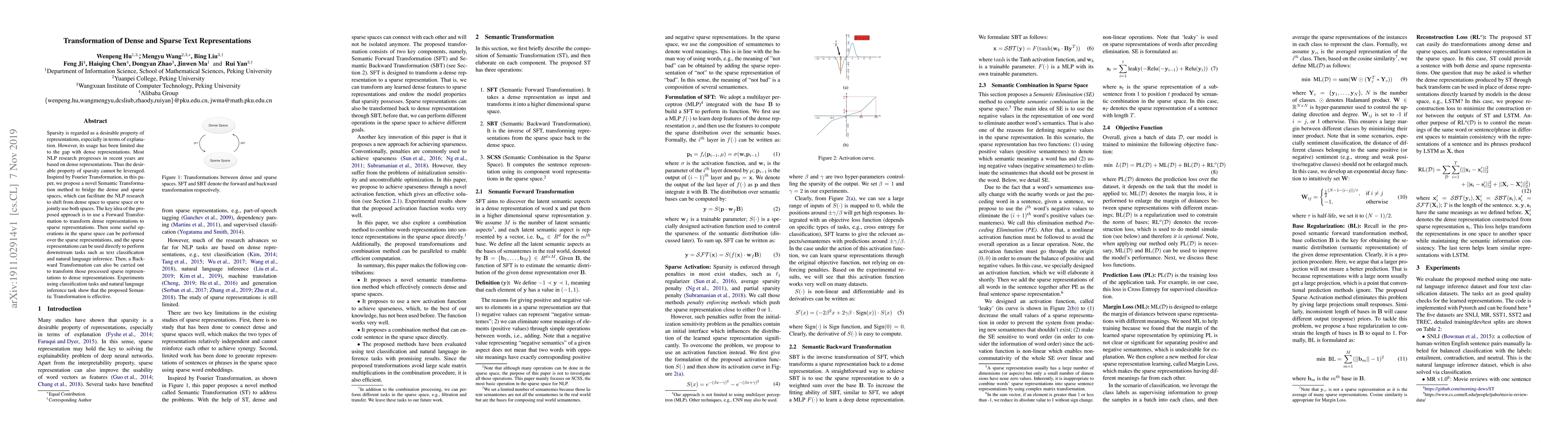 This paper introduces a novel Semantic Transformation method inspired by Fourier Transformation to bridge dense and sparse text representations, allowing NLP research to leverage the benefits of both. The method involves transforming dense representations to sparse ones, performing useful operations in the sparse space, and then converting them back to dense form, demonstrating effectiveness in text classification and natural language inference tasks.