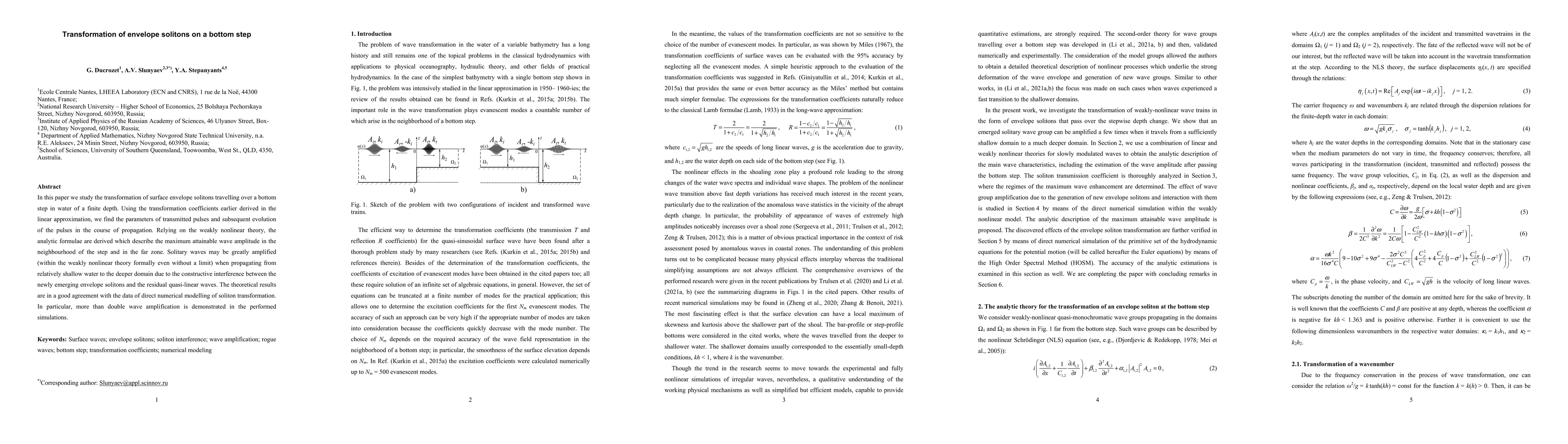 This paper investigates the transformation of envelope solitons over a bottom step in finite-depth water, deriving analytic formulae for transmitted pulse parameters and their evolution. It shows significant wave amplification due to constructive interference, with theoretical results corroborated by numerical simulations.
