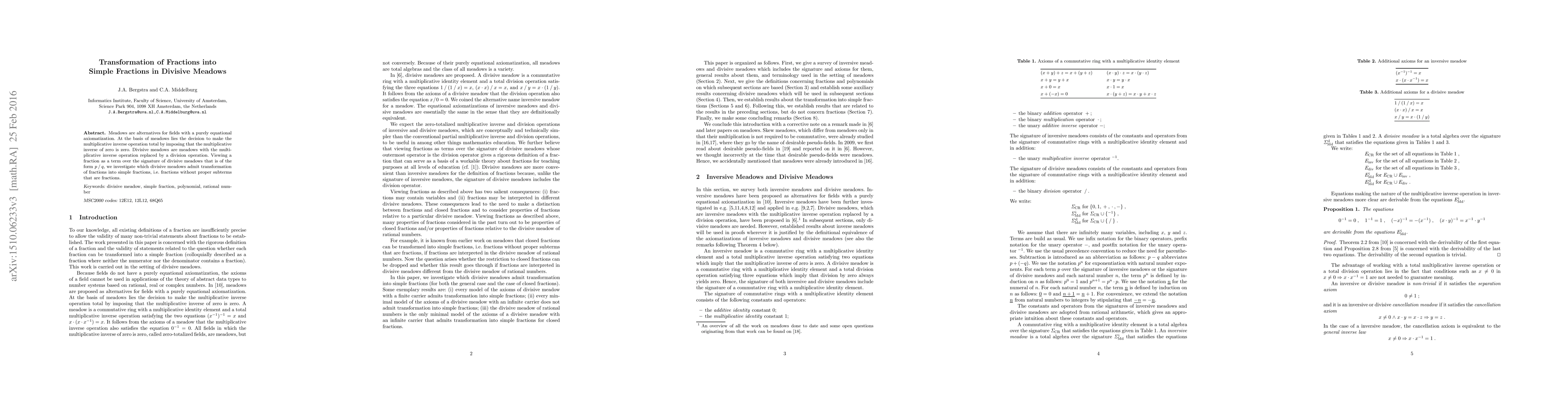 Meadows are alternatives for fields with a purely equational axiomatization. At the basis of meadows lies the decision to make the multiplicative inverse operation total by imposing that the multiplicative inverse of zero is zero. Divisive meadows are meadows with the multiplicative inverse operation replaced by a division operation. Viewing a fraction as a term over the signature of divisive meadows that is of the form p / q, we investigate which divisive meadows admit transformation of fractions into simple fractions, i.e. fractions without proper subterms that are fractions.