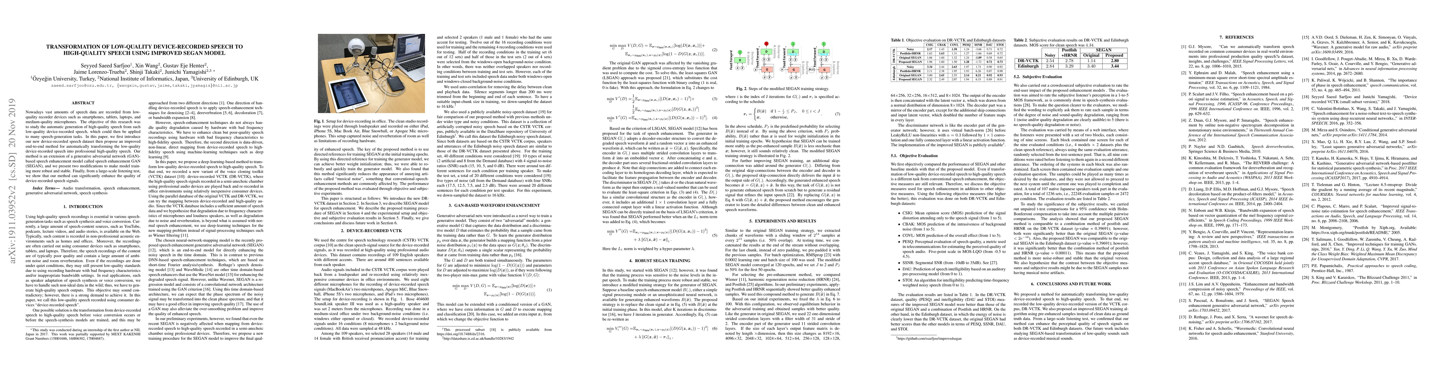This research introduces a new dataset of low-quality device-recorded speech and proposes an improved SEGAN model to transform it into high-quality speech. The enhancements include modifications to the SEGAN model for more robust training and stability, which significantly improve speech quality, as demonstrated by a large-scale listening test.