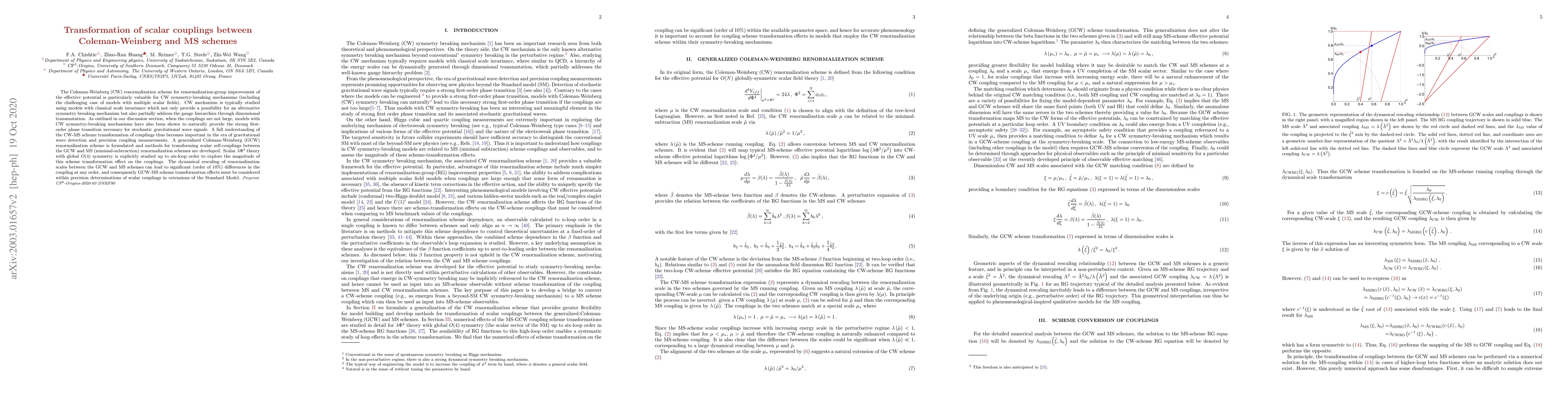 The Coleman-Weinberg (CW) renormalization scheme for renormalization-group improvement of the effective potential is particularly valuable for CW symmetry-breaking mechanisms (including the challenging case of models with multiple scalar fields). CW mechanism is typically studied using models with classical scale invariance which not only provide a possibility for an alternative symmetry breaking mechanism but also partially address the gauge hierarchies through dimensional transmutation. As outlined in our discussion section, when the couplings are not large, models with CW symmetry-breaking mechanisms have also been shown to naturally provide the strong first-order phase transition necessary for stochastic gravitational wave signals. A full understanding of the CW-MS scheme transformation of couplings thus becomes important in the era of gravitational wave detection and precision coupling measurements. A generalized Coleman-Weinberg (GCW) renormalization scheme is formulated and methods for transforming scalar self-couplings between the GCW and MS (minimal-subtraction) renormalization schemes are developed. Scalar $\lambda\Phi^4$ theory with global $O(4)$ symmetry is explicitly studied up to six-loop order to explore the magnitude of this scheme transformation effect on the couplings. The dynamical rescaling of renormalization scales between the GCW and MS schemes can lead to significant (order of 10\%) differences in the coupling at any order, and consequently GCW-MS scheme transformation effects must be considered within precision determinations of scalar couplings in extensions of the Standard Model.