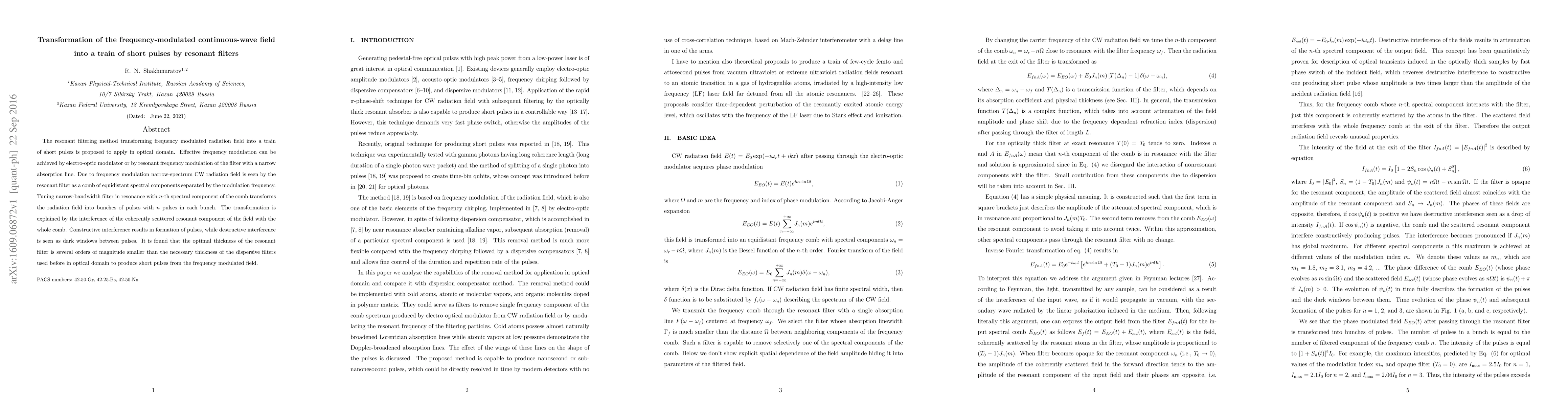 This paper proposes a resonant filtering method to transform frequency-modulated continuous-wave radiation into a train of short pulses, utilizing electro-optic modulators or resonant frequency modulation. The optimal filter thickness is significantly smaller than previous dispersive filters, achieving effective pulse formation through constructive interference.