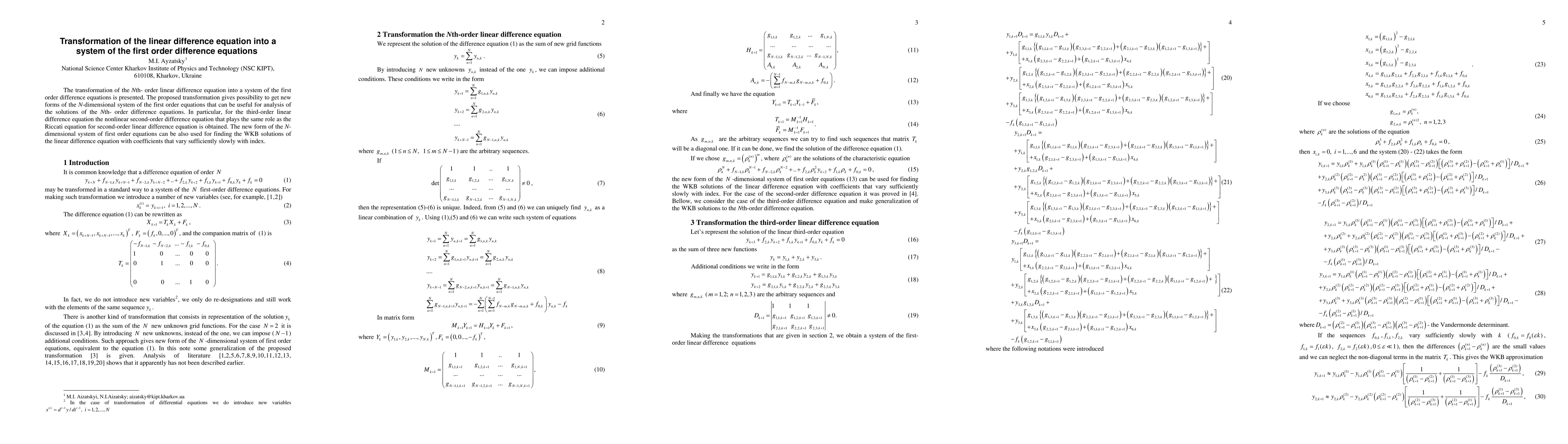 The transformation of the Nth- order linear difference equation into a system of the first order difference equations is presented. The proposed transformation gives possibility to get new forms of the N-dimensional system of the first order equations that can be useful for analysis of the solutions of the Nth- order difference equations. In particular, for the third-order linear difference equation the nonlinear second-order difference equation that plays the same role as the Riccati equation for second-order linear difference equation is obtained. The new form of the N-dimensional system of first order equations can be also used for finding the WKB solutions of the linear difference equation with coefficients that vary sufficiently slowly with index.