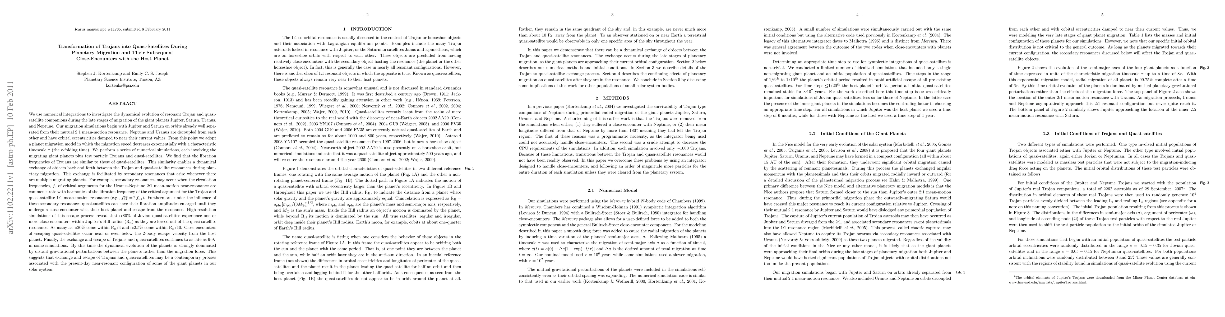We use numerical integrations to investigate the dynamical evolution of resonant Trojan and quasi-satellite companions during the late stages of migration of the giant planets Jupiter, Saturn, Uranus, and Neptune. Our migration simulations begin with Jupiter and Saturn on orbits already well separated from their mutual 2:1 mean-motion resonance. Neptune and Uranus are decoupled from each other and have orbital eccentricities damped to near their current values. From this point we adopt a planet migration model in which the migration speed decreases exponentially with a characteristic timescale tau (the e-folding time). We perform a series of numerical simulations, each involving the migrating giant planets plus test particle Trojans and quasi-satellites. We find that the libration frequencies of Trojans are similar to those of quasi-satellites. This similarity enables a dynamical exchange of objects back and forth between the Trojan and quasi-satellite resonances during planetary migration. Furthermore, under the influence of these secondary resonances quasi-satellites can have their libration amplitudes enlarged until they undergo a close-encounter with their host planet and escape from the resonance. High-resolution simulations of this escape process reveal that ~80% of Jovian quasi-satellites experience one or more close-encounters within Jupiter's Hill radius (R_H) as they are forced out of the quasi-satellite resonance. As many as ~20% come within R_H/4 and ~2.5% come within R_H/10. Close-encounters of escaping quasi-satellites occur near or even below the 2-body escape velocity from the host planet.