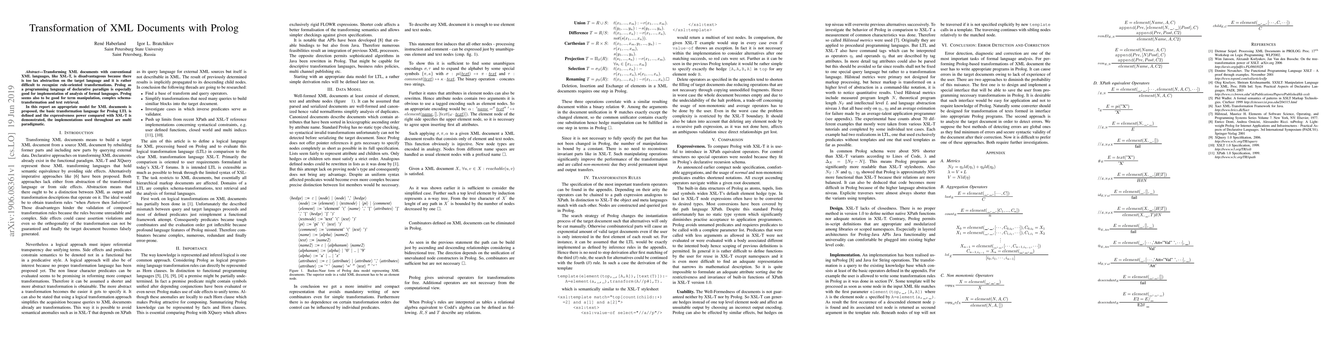 Transforming XML documents with conventional XML languages, like XSL-T, is disadvantageous because there is too lax abstraction on the target language and it is rather difficult to recognize rule-oriented transformations. Prolog as a programming language of declarative paradigm is especially good for implementation of analysis of formal languages. Prolog seems also to be good for term manipulation, complex schema-transformation and text retrieval. In this report an appropriate model for XML documents is proposed, the basic transformation language for Prolog LTL is defined and the expressiveness power compared with XSL-T is demonstrated, the implementations used throughout are multi paradigmatic.