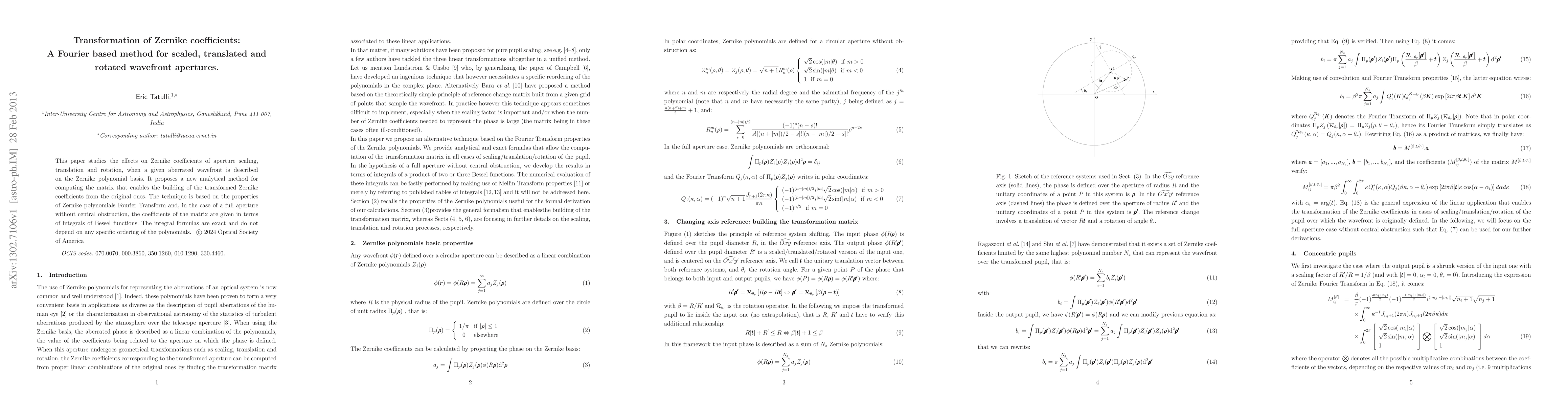 A new method for transforming Zernike coefficients is proposed, enabling the calculation of transformed coefficients from original ones after scaling, translation, or rotation of a wavefront aperture. The technique utilizes properties of Zernike polynomial Fourier Transform and exact integral formulas involving Bessel functions.