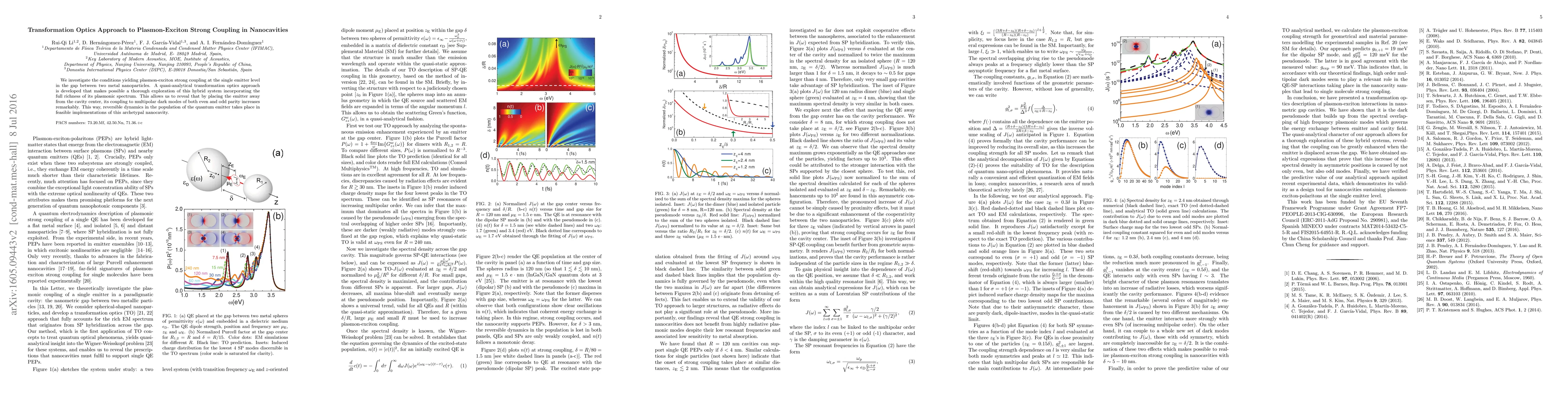 We investigate the conditions yielding plasmon-exciton strong coupling at the single emitter level in the gap between two metal nanoparticles. A quasi-analytical transformation optics approach is developed that makes possible a thorough exploration of this hybrid system incorporating the full richness of its plasmonic spectrum. This allows us to reveal that by placing the emitter away from the cavity center, its coupling to multipolar dark modes of both even and odd parity increases remarkably. This way, reversible dynamics in the population of the quantum emitter takes place in feasible implementations of this archetypal nanocavity.