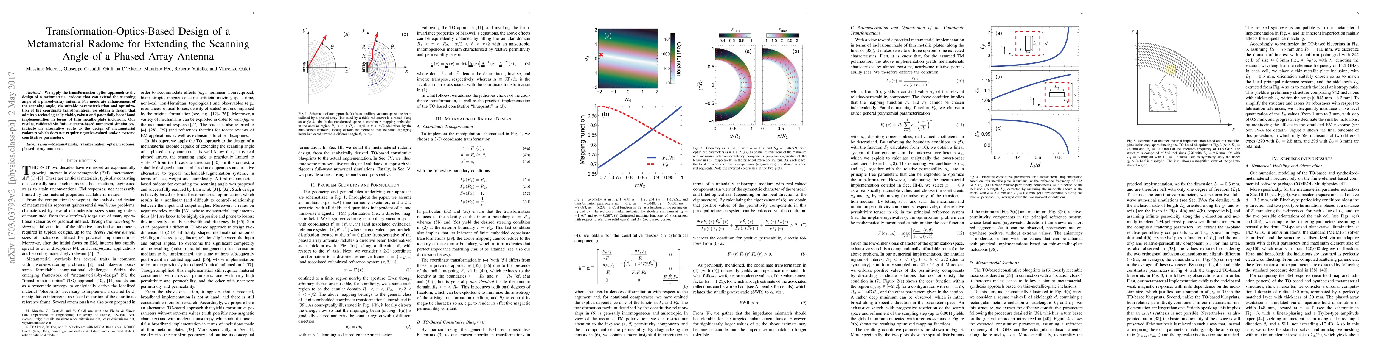We apply the transformation-optics approach to the design of a metamaterial radome that can extend the scanning angle of a phased-array antenna. For moderate enhancement of the scanning angle, via suitable parameterization and optimization of the coordinate transformation, we obtain a design that admits a technologically viable, robust and potentially broadband implementation in terms of thin-metallic-plate inclusions. Our results, validated via finite-element-based numerical simulations, indicate an alternative route to the design of metamaterial radomes which does not require negative-valued and/or extreme constitutive parameters.