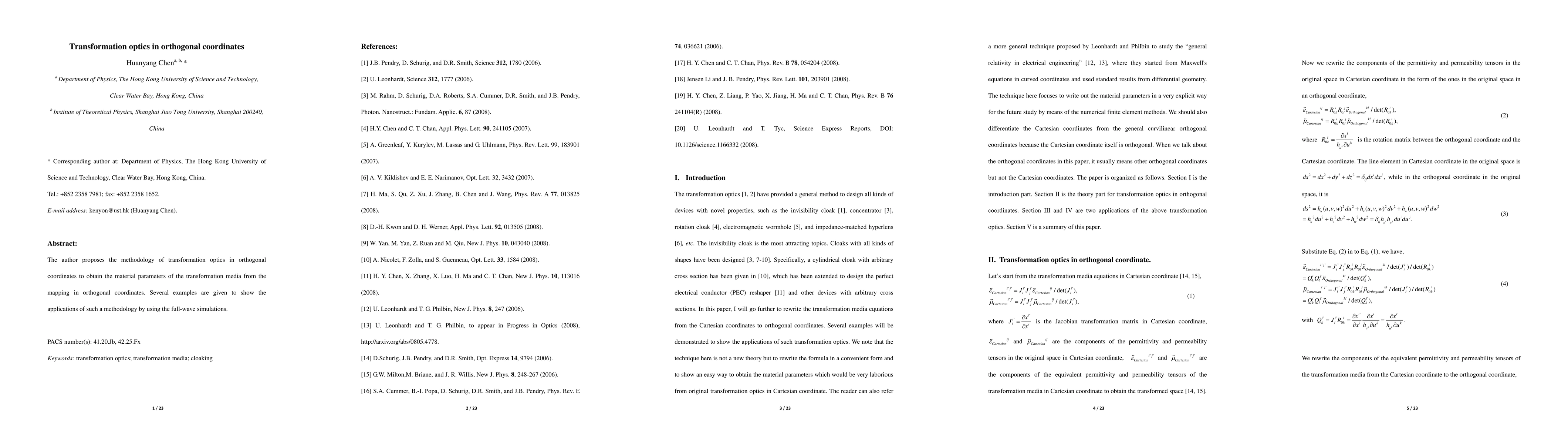 Summary: This paper introduces a methodology for transformation optics in orthogonal coordinates to derive material parameters, demonstrating its application through full-wave simulations and providing several examples to illustrate its effectiveness.