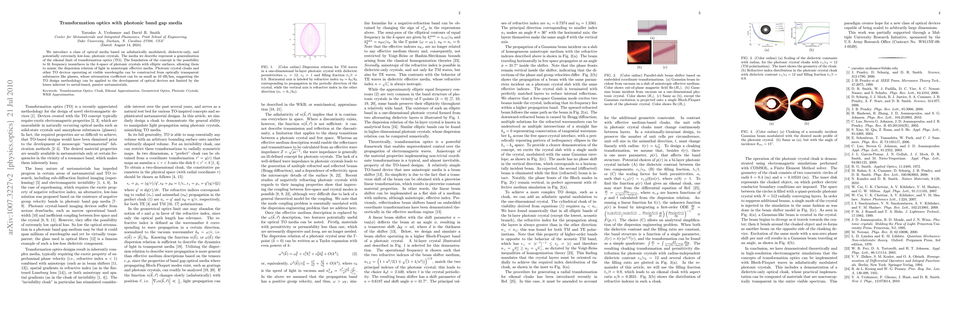 We introduce a class of optical media based on adiabatically modulated, dielectric-only, and potentially extremely low-loss, photonic crystals. The media we describe represent a generalization of the eikonal limit of transformation optics (TO). The foundation of the concept is the possibility to fit frequency isosurfaces in the k-space of photonic crystals with elliptic surfaces, allowing them to mimic the dispersion relation of light in anisotropic effective media. Photonic crystal cloaks and other TO devices operating at visible wavelengths can be constructed from optically transparent substances like glasses, whose attenuation coefficient can be as small as 10 dB/km, suggesting the TO design methodology can be applied to the development of optical devices not limited by the losses inherent to metal-based, passive metamaterials.