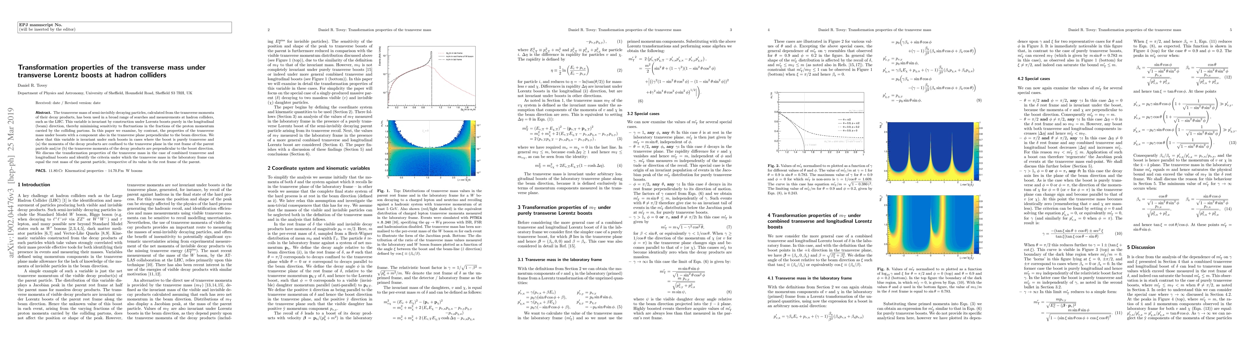 This paper investigates the invariance of the transverse mass under transverse Lorentz boosts at hadron colliders, demonstrating that it remains unchanged when decay products' momenta are confined to the transverse plane or are perpendicular to the boost direction. It also explores the conditions under which the transverse mass in the laboratory frame equals the rest mass of the parent particle, regardless of the rest frame value.