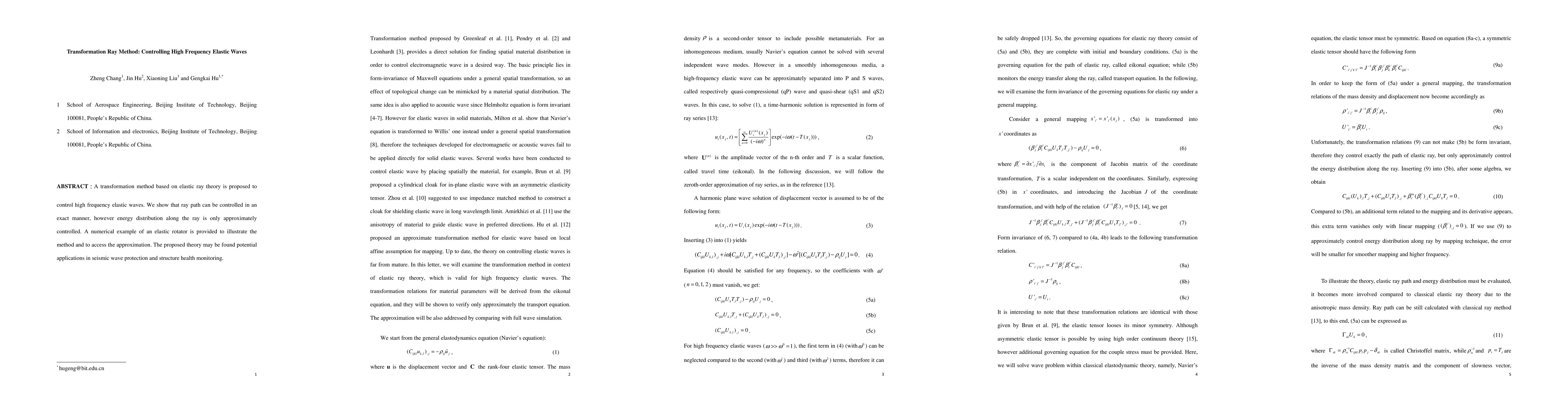 A transformation method based on elastic ray theory is proposed to control high frequency elastic waves. We show that ray path can be controlled in an exact manner, however energy distribution along the ray is only approximately controlled. A numerical example of an elastic rotator is provided to illustrate the method and to access the approximation. The proposed theory may be found potential applications in seismic wave protection and structure health monitoring.