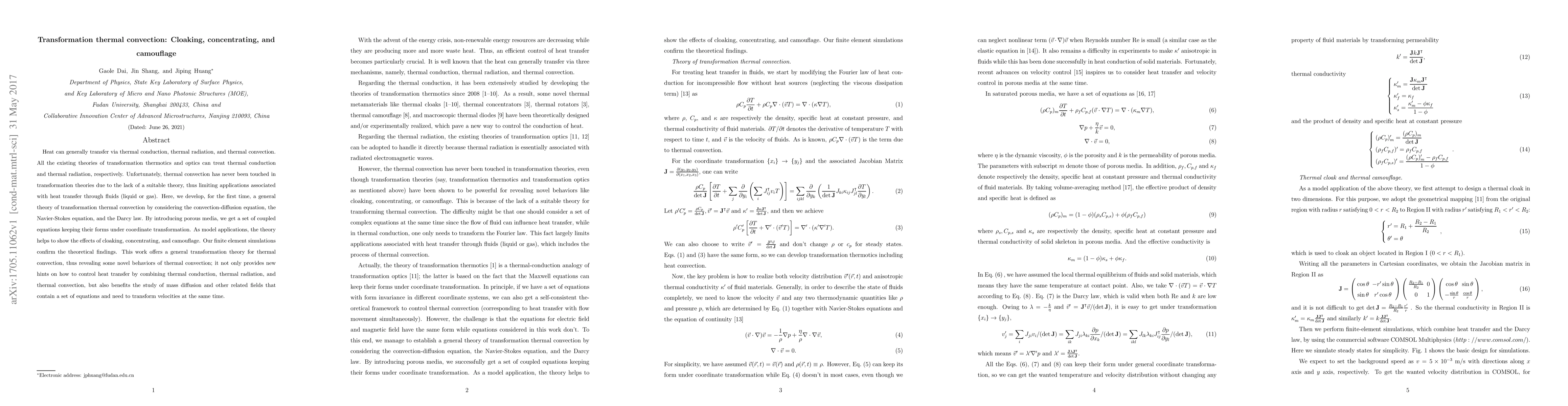 This paper develops a novel theory of transformation thermal convection, addressing the convection-diffusion, Navier-Stokes, and Darcy equations. It introduces porous media to maintain equation forms under transformations, enabling cloaking, concentrating, and camouflage effects, confirmed by finite element simulations.