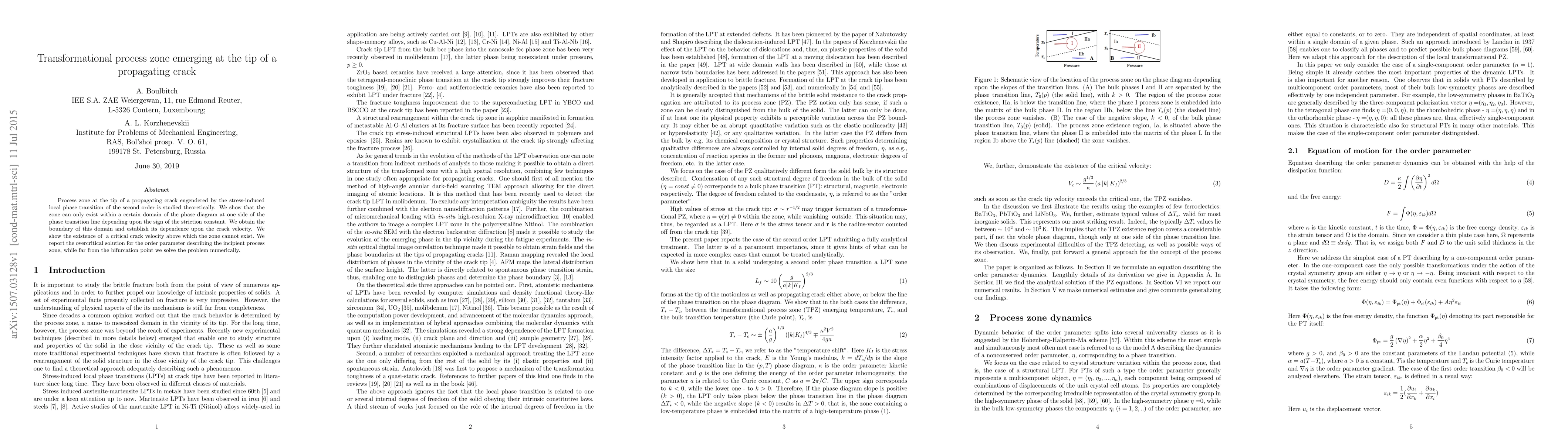 This paper theoretically investigates the transformational process zone emerging at the tip of a propagating crack, revealing its existence within a certain phase domain dependent on the striction constant and crack velocity. It establishes a critical crack velocity above which the process zone cannot exist and provides solutions for the order parameter both near and far from the bifurcation point.