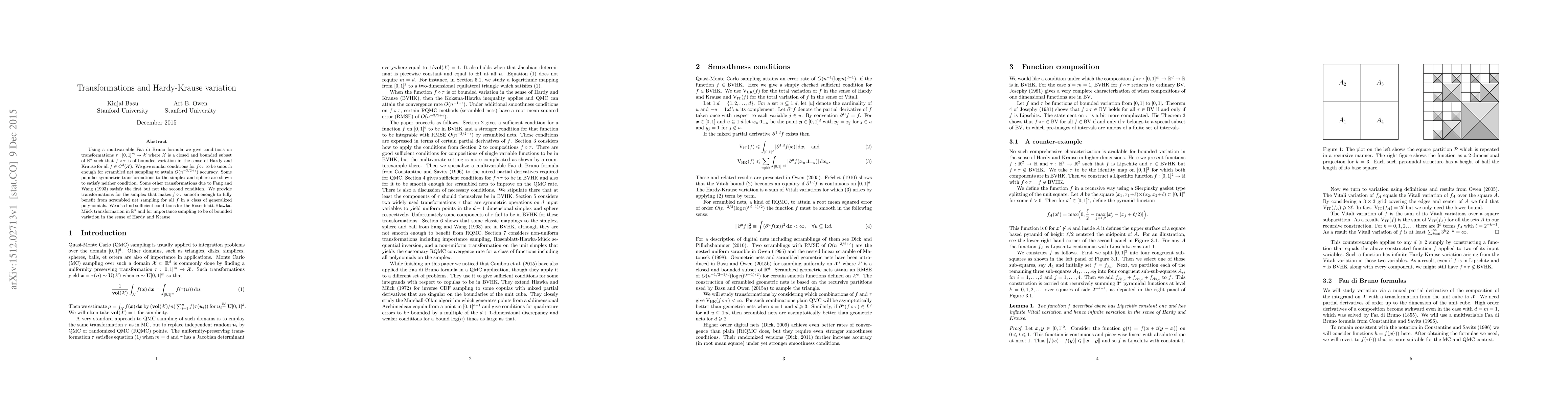 Using a multivariable Faa di Bruno formula we give conditions on transformations $\tau:[0,1]^m\to\mathcal{X}$ where $\mathcal{X}$ is a closed and bounded subset of $\mathbb{R}^d$ such that $f\circ\tau$ is of bounded variation in the sense of Hardy and Krause for all $f\in C^d(\mathcal{x})$. We give similar conditions for $f\circ\tau$ to be smooth enough for scrambled net sampling to attain $O(n^{-3/2+\epsilon})$ accuracy. Some popular symmetric transformations to the simplex and sphere are shown to satisfy neither condition. Some other transformations due to Fang and Wang (1993) satisfy the first but not the second condition. We provide transformations for the simplex that makes $f\circ\tau$ smooth enough to fully benefit from scrambled net sampling for all $f$ in a class of generalized polynomials. We also find sufficient conditions for the Rosenblatt-Hlawka-M\"uck transformation in $\mathbb{R}^2$ and for importance sampling to be of bounded variation in the sense of Hardy and Krause.