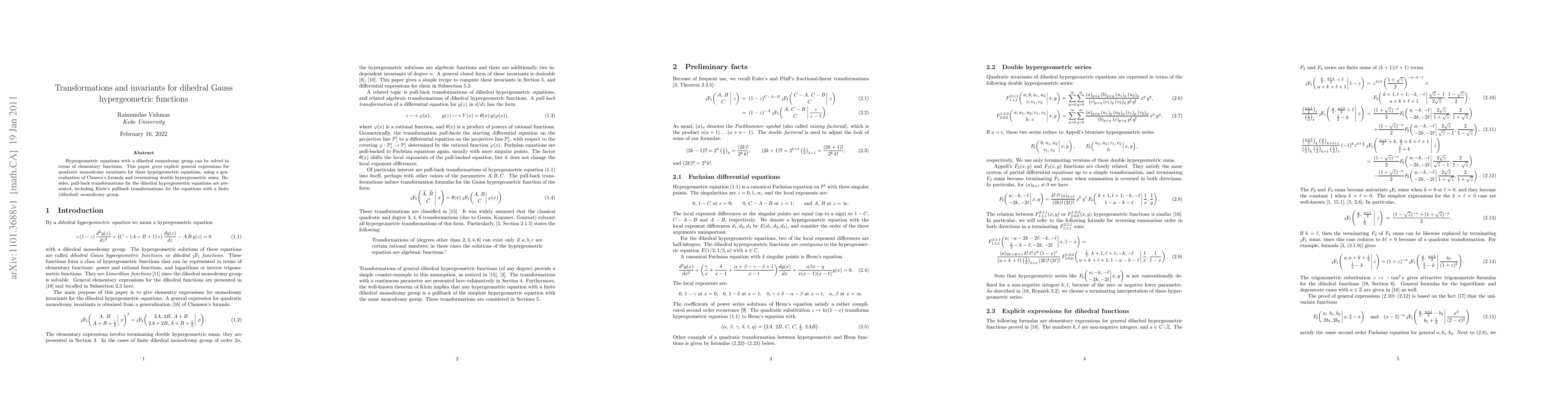 This paper provides explicit general expressions for quadratic monodromy invariants for hypergeometric equations with a dihedral monodromy group, utilizing Clausen's formula and terminating double hypergeometric sums. It also presents pull-back transformations for these equations, including Klein's transformations.