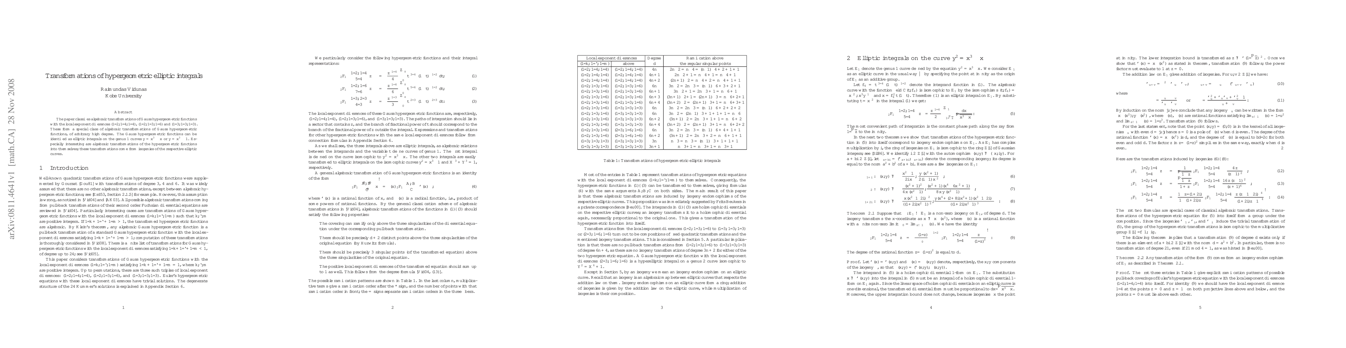 The paper classifies algebraic transformations of Gauss hypergeometric functions with specific local exponent differences, identifying them as elliptic integrals on genus 1 curves. Transformations of these hypergeometric functions into themselves arise from isogenies of the corresponding elliptic curves.